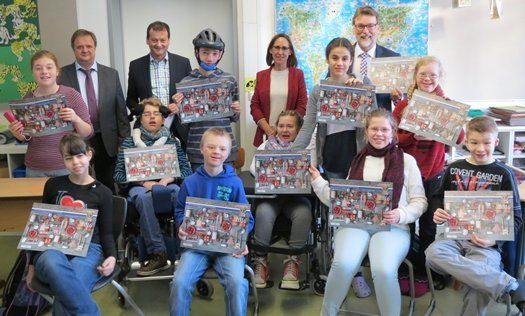 Über je einen Adventskalender des Lions Clubs Pfaffenhofen/Hallertau können sich die rund 65 Klassen und Gruppen des Heilpädagogischen Zentrums in Pfaffenhofen und Geisenfeld freuen. Landrat Martin Wolf überreichte die Kalender gemeinsam mit Vertretern des Fördervereins an die Kinder und Jugendlichen der Adolf-Rebl-Schule.