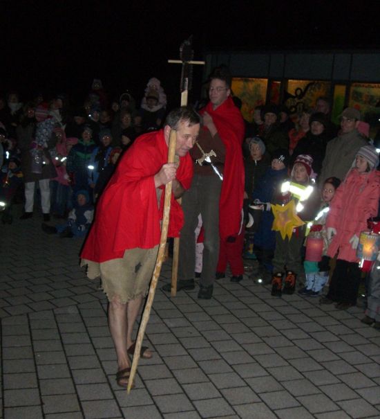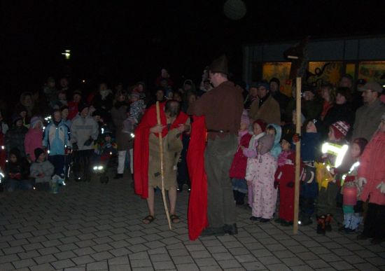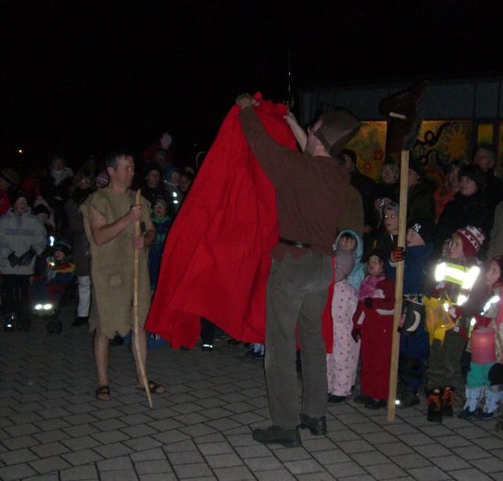 Nach dem Umzug wurde vor dem Kindergarten an der Mißbergstraße die Szene des Mantelteilens von den Beteiligten mit voller Hingabe gespielt. Anschließend gab es für die durchgefrorenen Körper einen Kinderpunsch, Glühwein und selbstgebackene Kekse.