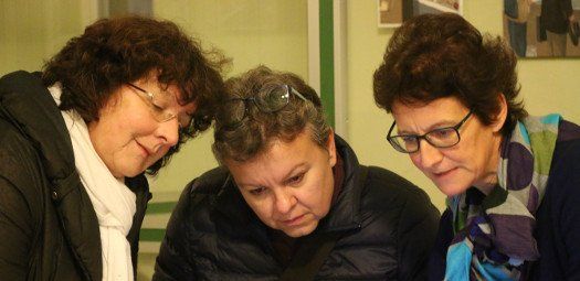 Bärbel Ritthammer (rechts) informiert Besucherinnen über die Begleitmaterialien zur Ausstellung