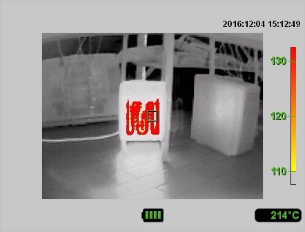 Das Foto rechts zeigt ein Realbild der Wärmebildkamera; deutlich zu sehen ist der Brandherd,der aufgrund der Temperatur rot eingefärbt ist.