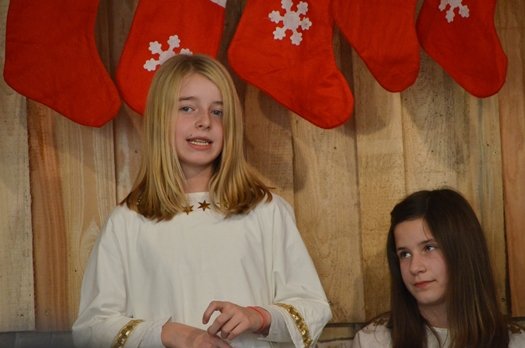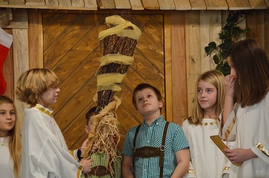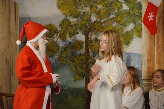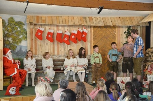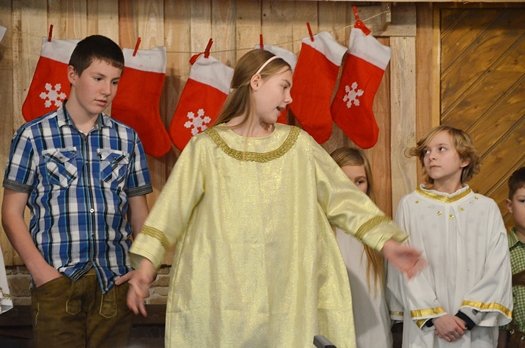 Doch gemeinsam schaffen es die Engel, alle Wünsche zu erfüllen und trotzdem der Tradition treu zu bleiben. Unter der Regie von Susanne Scheben spielten beeindruckend die Mädchenengel Engel Sophia Leitermann als Susi, Johanna Schreyer (Moni), Carla Raslag (Elfi), Aurelia Heinz (Lilli) und Isabel Redl (Vroni); die Bubenengel verkörperten ebenso souverän Florian Weber als Tobi, Korbinian Hobmeier (Hansi) Philipp Scheben (Tommi) und Timo Scheben (Seppi). In die Rolle des Weihnachtsmannes schlüpte Henry Raslag und Miriam Leitermann mimte das Christkind und fungierte auch als Erzählerin.
