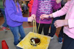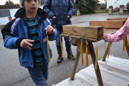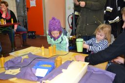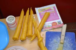 Vor allem die Kinder waren begeistert dabei, denn es gab die Möglichkeit, sich Kerzen selber zu ziehen oder sich eine Kerze aus Bienenwachsplatten selber zu rollen. Für das Kerzenziehen waren zwei Behälter mit warmen Wachs aufgestellt und die Kinder tauchten ihre langen Dochte immer wieder in das warme Wachs, so dass bei jedem Mal etwas mehr Wachs hängen blieb. Dann mussten sie mit ihren dünnen Wachsfäden nach draußen zum kurzen Abkühlen um dann den Zieh-Prozess immer wieder zu wiederholen, bis es dann wie eine richtige Bienenwachskerze aussah.