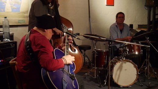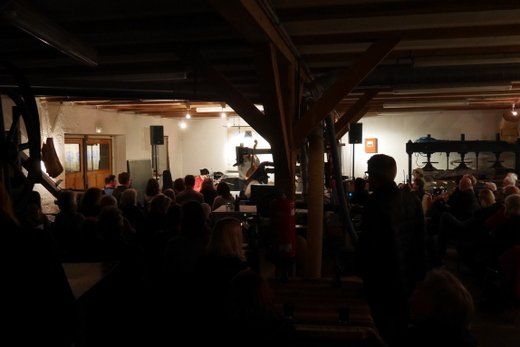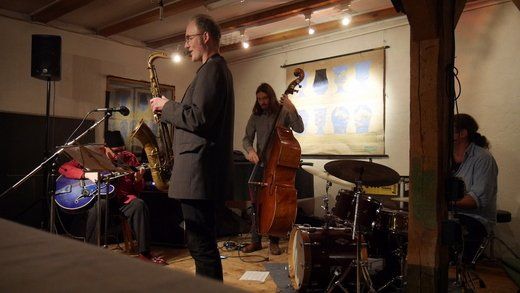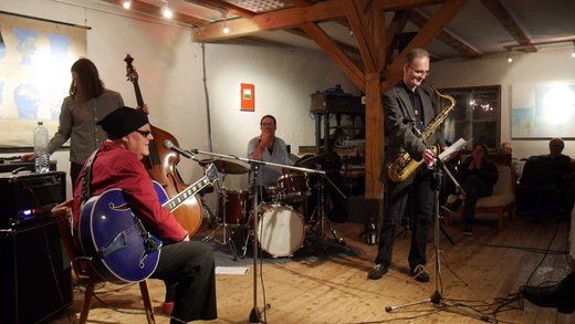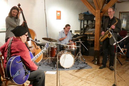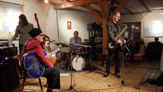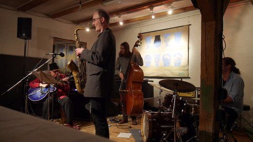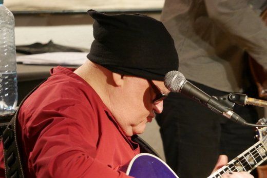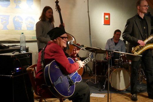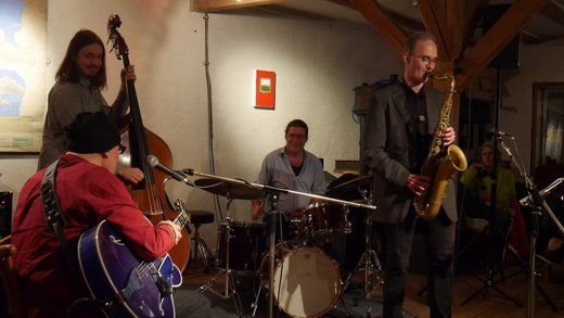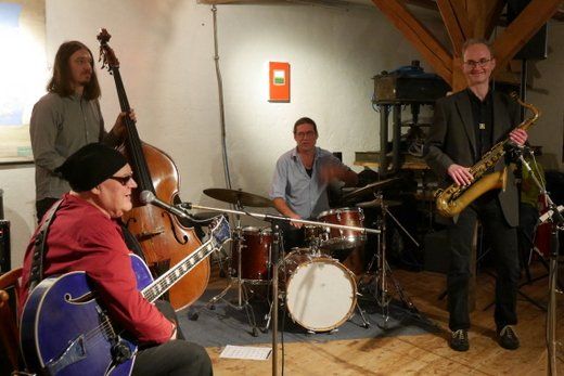 Begleitet wurde er von der „kleinen Hausmusik“ der Werkstadt, Andy Kurz – Bass, Christoph Hörmann – Saxophon, Sebastian Nay – Schlagzeug. Gemeinsam brachten sie den Abend zum Schweben, das fasst gefesselte Publikum gab immer wieder Zwischenapplaus und als Karl Ratzer auch noch seine ganz eigene Stimme mit einbrachte, war das Staunen groß.
