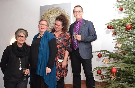 Kurz vor Eröffnung des Christkindlmarktes war am Wochenende die Vernissage. Es gibt diesmal so viele Bilder zu sehen, dass der Rathausflur sprichwörtlich bis unters Dach mit ihnen ausstaffiert wurde. Bürgermeister Michael Franken (JWU) sprach in seiner Vorstellung des Malerinnentrios von „tollen, hochwertigen Bildern“ aktueller, zeitgenössischer Malerinnen. Ausdrucksstärke sei darin ebenso zu erkennen wie Engagement und Persönlichkeit. Viele der exponierten Werke seien darunter, „die zum Nachdenken anregen.“