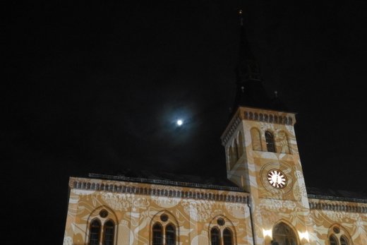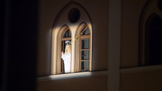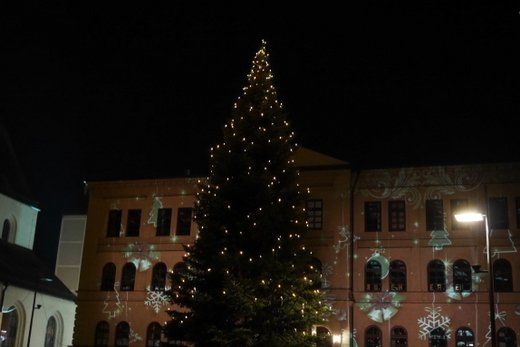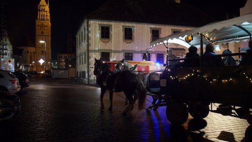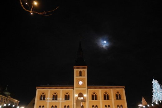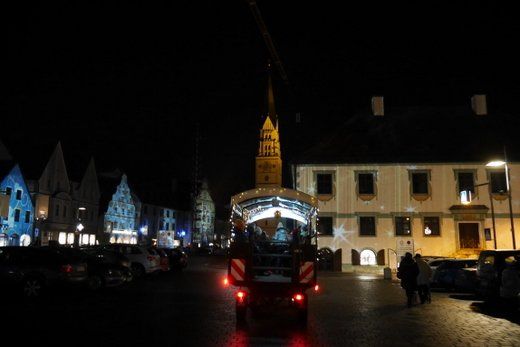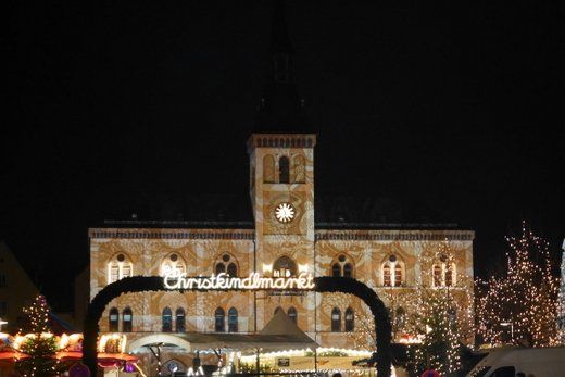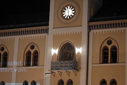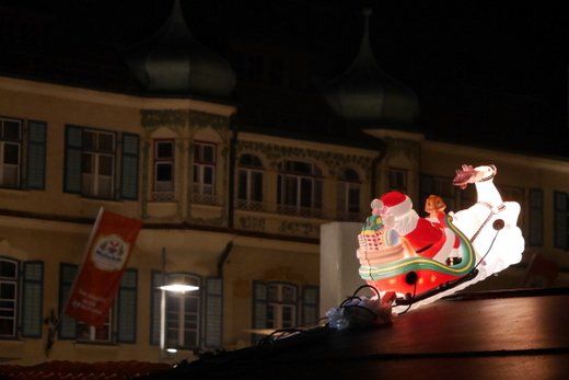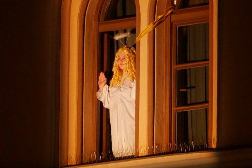 Mittig auf dem Rathausbalkon steht dann neben zwei schützenden Engeln normalerweise das Christkind und singt eine frohe Botschaft.