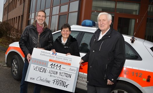 Einen symbolischen Spendenscheck mit einer Summe von exakt 1111 Euro überreichte Christine Frank am heutigen Nachmittag vor der Pfaffenhofener BRK-Rettungswache an die beiden Vorsitzenden des Vereins "Leben retten" Rudi Engelhard und Olaf Ruchnewitz, der zugleich auch einer von den drei Leitenden Notärzten im Landkreis Pfaffenhofen ist.