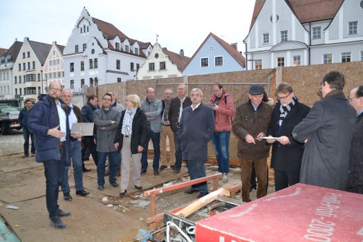 Der geplante Sitzungssaal im Obergeschoss des Gebäudes ist ausgelegt auf 70 Sitzungsteilnehmer im Hinblick auf weiteres Wachstum des Landkreises und seiner Kreisräte. Er kann aber auch bei anderer Bestuhlung für andere Veranstaltungen mit deutlich mehr Personen genutzt werden. Die zukünftig verglaste Fensterfront bietet bereits jetzt einen herrlichen Ausblick auf die Altstadt und den Hauptplatz. Die Mitglieder des Ausschusses waren beeindruckt von der Größe und Raumhöhe ihres zukünftigen Tagungsraums. Im Anschluss daran war die Entscheidung über die Gestaltung der gesamten Fassade mit den Zwischenräumen der Fenster, die paarweise Richtung Hauptplatz angeordnet sind. Von den Architekten wurden vier Farbvorschläge mit kleinen Tafeln provisorisch zwischen den Fenster angebracht und schon beim Außentermin war die Stimmungslage klar. Eigentlich sprachen sich alle für die Variante des leichten Brauntones aus, der am besten mit den dunklen Metall-Fensterrahmen und der weißen Fassade harmoniert. So fiel dann auch die Entscheidung später bei der Sitzung einstimmig aus.