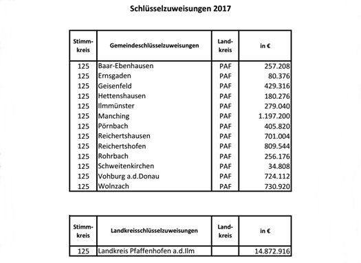 Im kommenden Jahr fließen rund 21 Millionen Euro aus den Schlüsselzuweisungen in den Landkreis Pfaffenhofen. Das teilt heute der hiesige CSU-Landtagsabgeordnete Karl Straub mit. Die kreisangehörigen Gemeinden erhalten davon zusammen knapp 6,1 Millionen Euro, der Landkreis knapp 14,9 Millionen Euro.