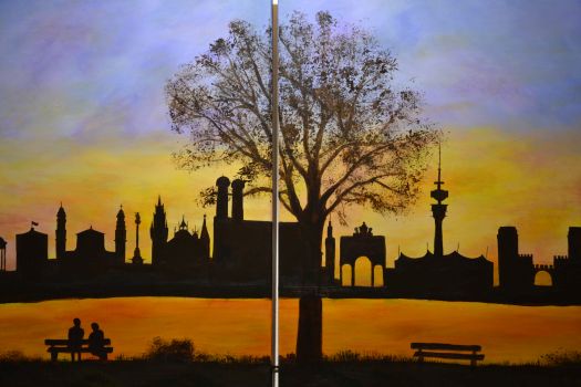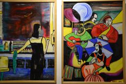 Aus diesen Überlegungen heraus ging Reinhard Haiplik auf die ausgestellten 21 Werke der 15 Künstler ein und hob bei Sonja Frimmers Bild „Das letzte Licht“ hervor, wie die Sonne als glutroter Ball ihr letztes Licht über tiefem Dunkel der Bäume und Halme schickt, die sich mit einem Insekt im Winde wiegen. Oder Dorothee Bornemanns „Jäger in der Dämmerung“, der sich im blauen Licht der Dämmerung vor einem schwarzen Hintergrund auf seinen Nachtflug begibt. Oder wie sich ein Paar bei Heidi Wilhelm nach einem Abendespaziergang auf einer Bank sitzend die schwarze Silhouette ihrer Stadt betrachtet – warme Farben im Vordergrund und der bedrohliche schwarze Schatten der Stadt. Und das Bild von Ingwelde Reinhold inspirierte Haiplik bei seiner Betrachtung zu der Überlegung, ob die Frau mit dem geöffneten Mund und dem vor ihr fliegenden Vogel sich dem Versprechen der Blauen Stunde hingibt oder ob sie der Sucht nach Betäubung und Halbschlaf hingibt, wie eine Literaturwissenschaftlerin die Blaue Stunde nennt.