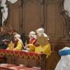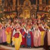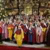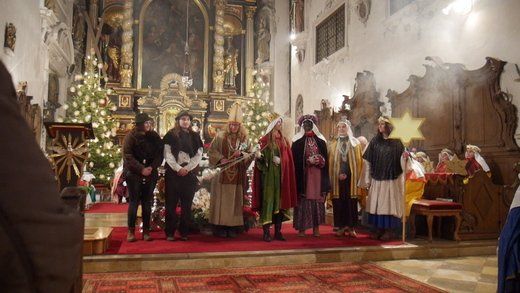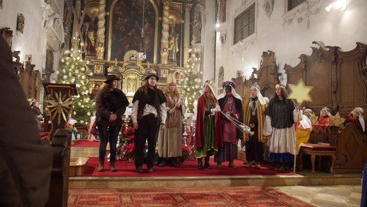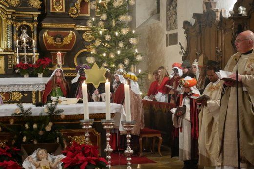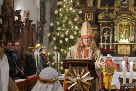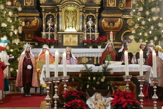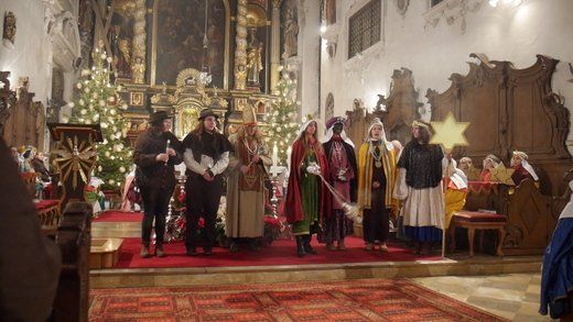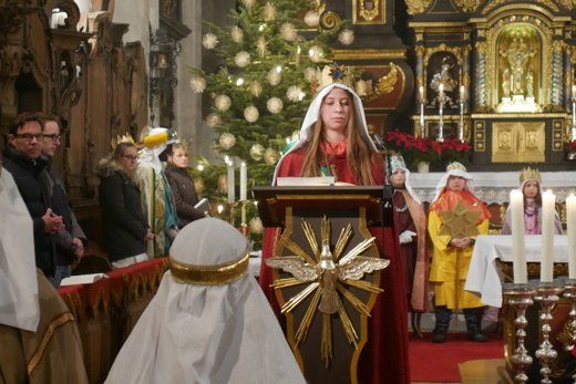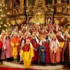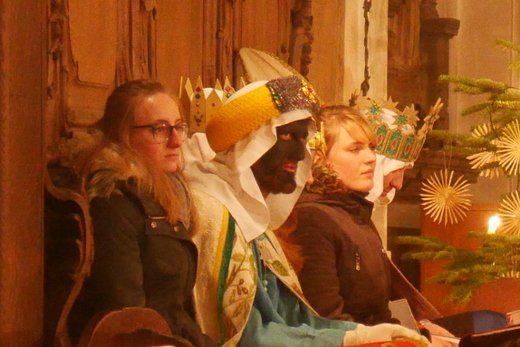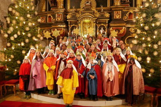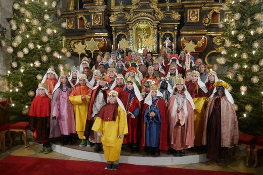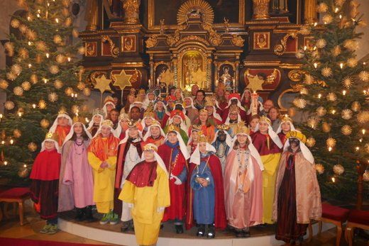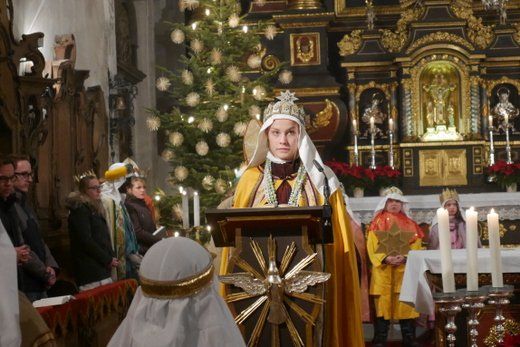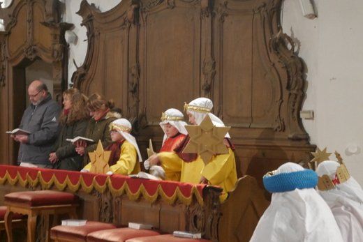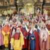 Bei einem kurzen Auftritt vor der Gemeinde, erzählten die Älteren noch einmal die Geschichte der drei Könige aus dem Morgenland, bei ihrer Suche nach dem königlichen Kind. Beim Abschlussgottesdienst treten die Könige natürlich mit Musik, Gefolge, Hirten und Herodes auf. Den Hintergrund bilden, mit ihren farbenprächtigen Gewändern, die restlichen Mitglieder der großen Sternsinger Gemeinschaft.