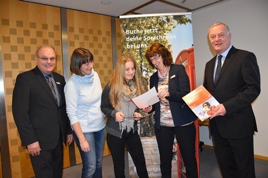 Bei der Infoveranstaltung für die Sparkassen-Sprachreisen 2017: Aus der Hand von Marketingleiterin Birgit Distler nahmen die Interessenten die Ausschreibungs- und Anmeldeunterlagen entgegen. Ganz links Sparkassen-Vorstandsmitglied Stefan Maier, ganz rechts Managing Director Thorsten Geppert von „albion language tours“. Foto: M. Hailer / Sparkasse Pfaffenhofen