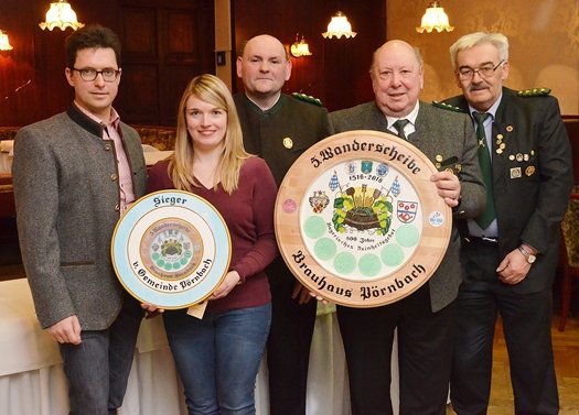 Umrahmt von Pörnbachs Bürgermeister Helmut Bergwinkel und den Schützenmeistern von Freischütz Pörnbach, Christian Lutz, Geisberg Pörnbach, Herbert Mair und Freischütz Puch, Robert Hackl, freute sich Daniela Märkl über ihren Erfolg beim Ausschießen der Graf-Toerring-Wanderscheibe 2017.