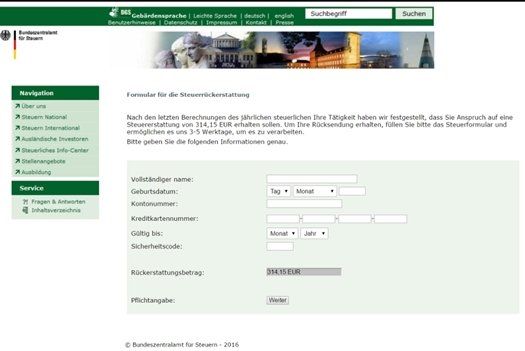 In der erhaltenen E-Mail geben sich die Betrüger als Bundeszentralamt für Steuern aus. Ohne direkte Anrede wird darauf hingewiesen, dass die Adressaten, nach den letzten Berechnungen, einen Anspruch auf eine Steuererstattung in konkreter Höhe erhalten sollen. Um das Geld zu bekommen, muss nur der in der E-Mail angegebene Link geklickt und das Antragsformular ausgefüllt werden. Was wie eine harmlose Anmeldung auf der Behördenseite aussieht, endet mit der Herausgabe privater Angaben, allen voran Name, Geburtsdatum, Bankverbindung sowie Kreditkartennummer einschließlich Prüfziffer.