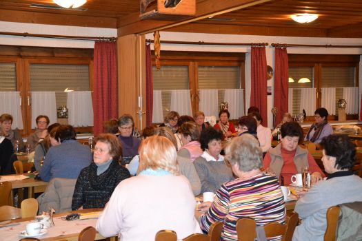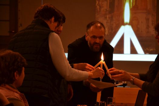 Mit seiner angenehmen leichten Gesprächsführung kam er dabei auch auf Fragen des Glaubens zu sprechen, zum Beispiel über die Dreieinigkeit von Vater, Sohn und Heiligem Geist. Er stellte dabei die Frage in den Raum, wie es denn diese Dreieinigkeit geben könne und demonstrierte mit drei Kerzen, die er den Damen gab, dass aus drei Flammen eine Flamme werden kann. Auch mit kleinen dreifarbigen Kreiseln demonstrierte er, dass sich beim schnellen Drehen aus den drei Farben eine Farbe ergibt. Auf seine Frage, zu wem die Frauen beten würden, gab es verschiedene Antworten. Bei einer Frau kam spontan „Maria“, bei vielen Gott oder Jesus, aber bei keiner kam der Heilige Geist vor, wobei Pater Benedikt darauf hinwies, dass die Verehrung von Maria als Heilige nicht gleichzusetzen sei mit Gott. Er zeigte auch auf, dass es zwischen der evangelischen und katholischen Kirche einen gewaltigen Unterschied gebe, denn in der evangelischen Kirche werden keine Heiligen angebetet.