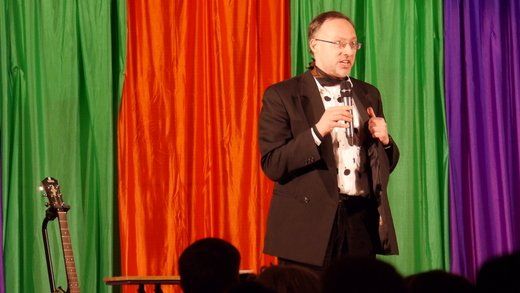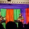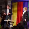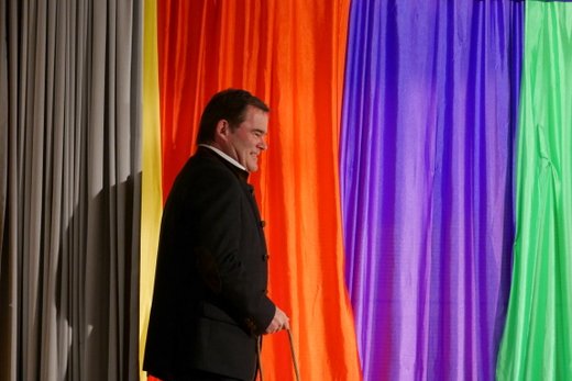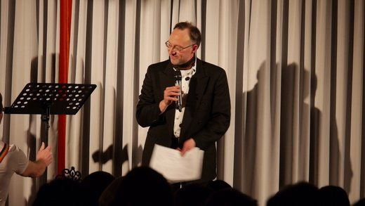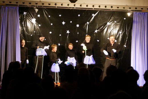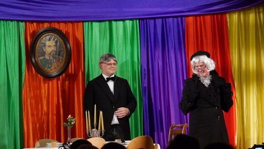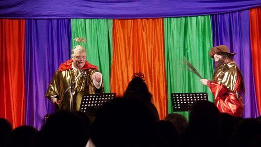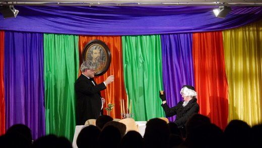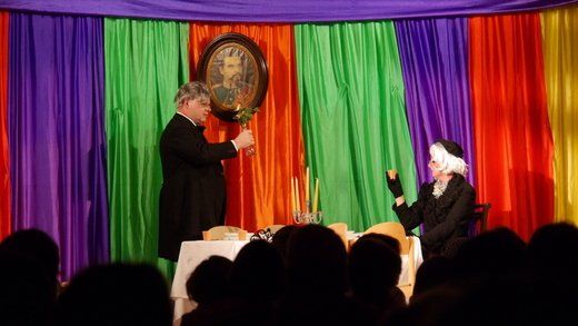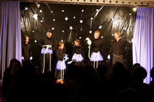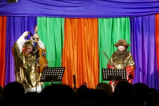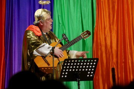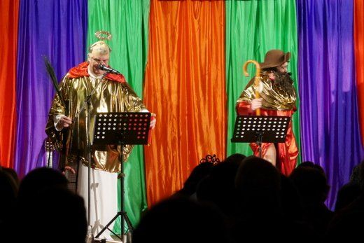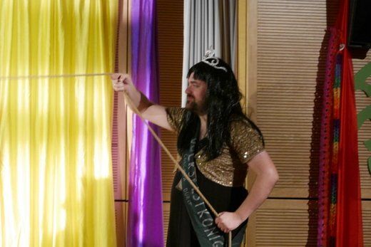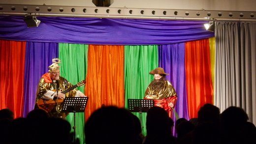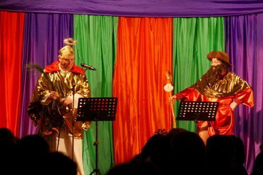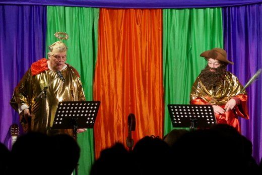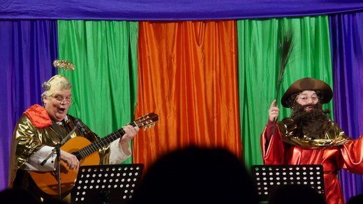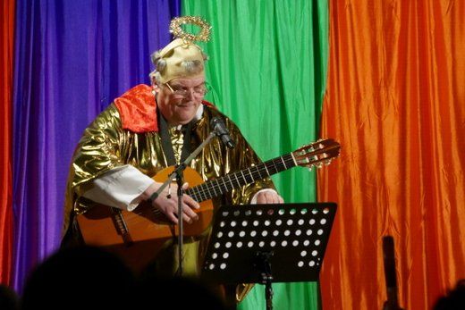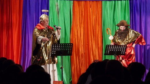 Mehr Rockmusik hatte eine Kolpinggruppe dabei, zur Bohemian Rhapsody von Freddy Mercury tanzen lustige Storchenfiguren im Schwarzlicht, sehr gelungen. Eine kirchengeschichtliche Lehrstunde mit Lokalkolorit, erteilten dann Rocco & Lenz, alias die Brehers, alias die altehrwürdigen Heiligen Rochus und Laurentius aus der Hauskirche St. Johannes Baptist. Vermutungen, dass die Gemeinde das ewige Licht an einen Händler verkauft haben soll, um damit den Schuldenstand zu tilgen, wurden nicht bestätigt. Nummern wie diese gehören eigentlich zur Starkbierzeit noch einmal gespielt, zu dicht war der Text und zu leicht überhörbar die deftigen Seitenhiebe.