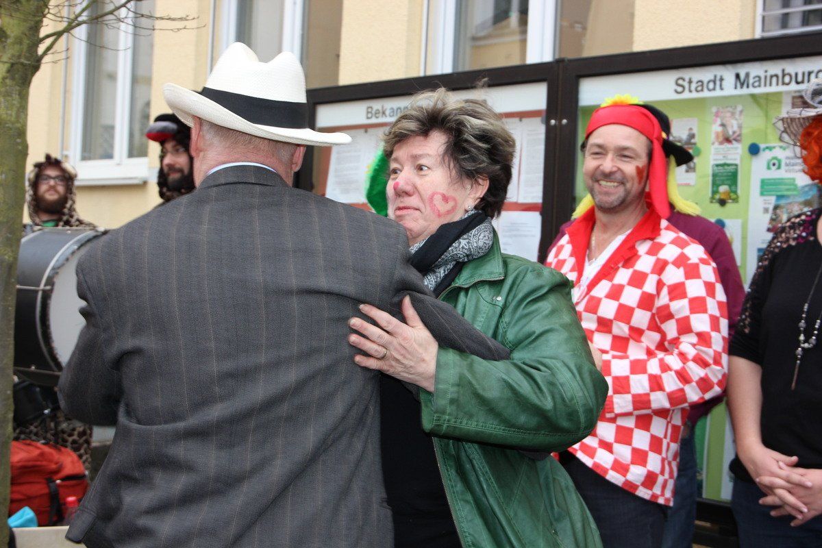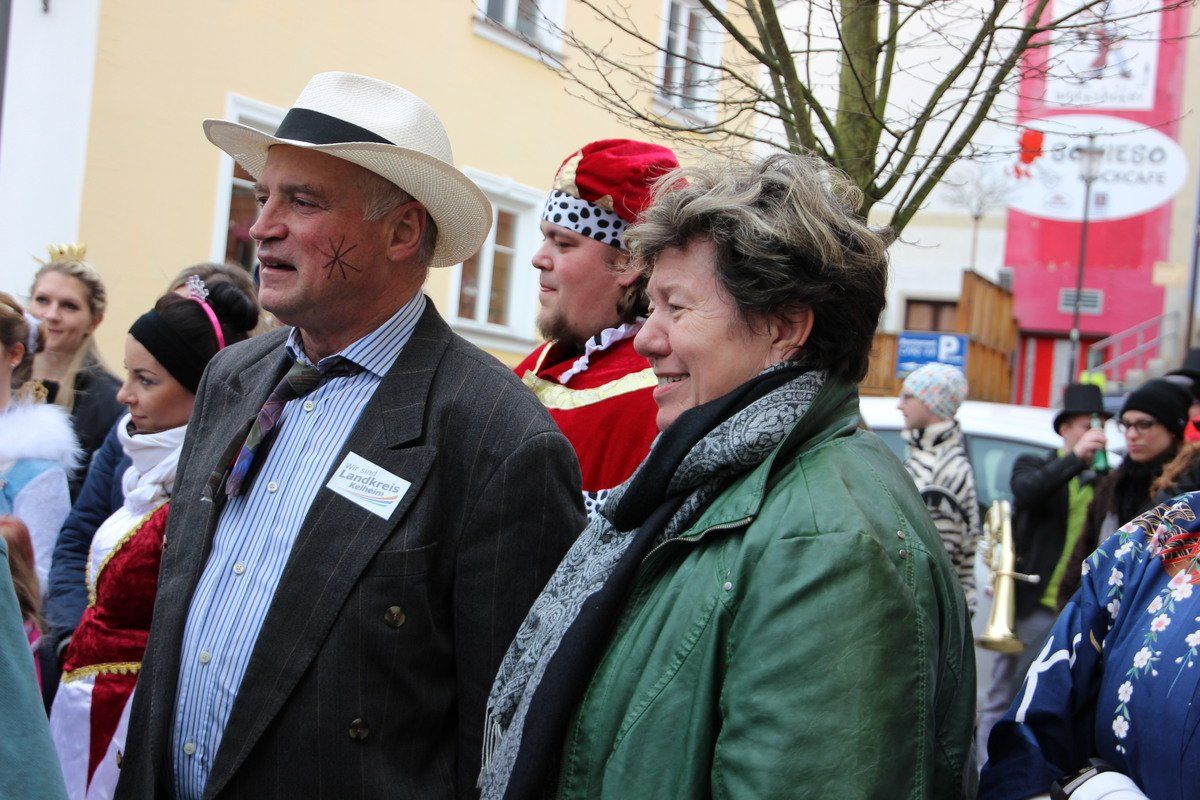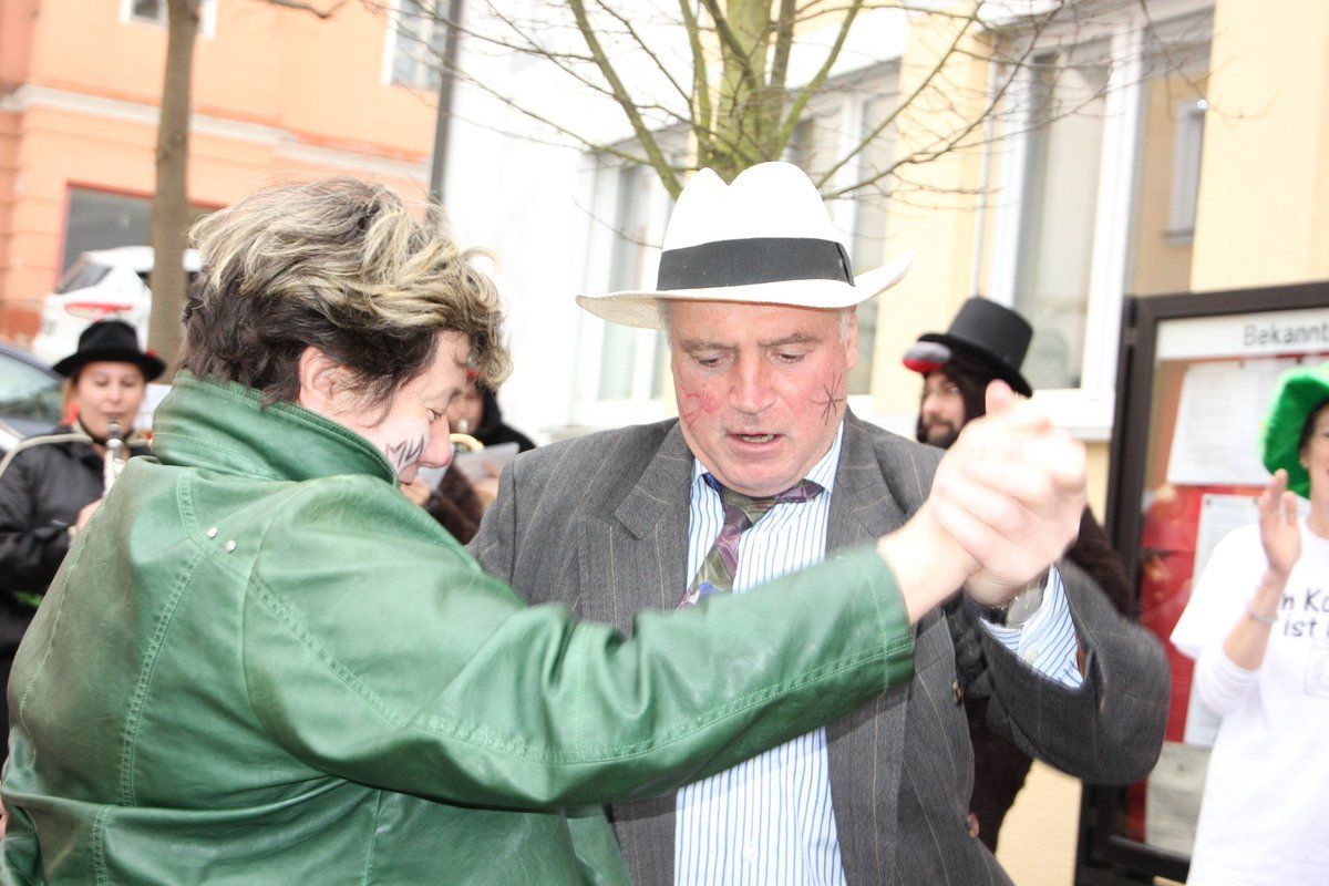 Bürgermeister Sepp Reiser bewies, dass er kein Faschingsmuffel ist, sondern zeigte sich von seiner ausgelassenen Seite und schwang unbefangen mit seiner Stellvertreterin Langwieser ein flottes Bein vor dem Rathaus.