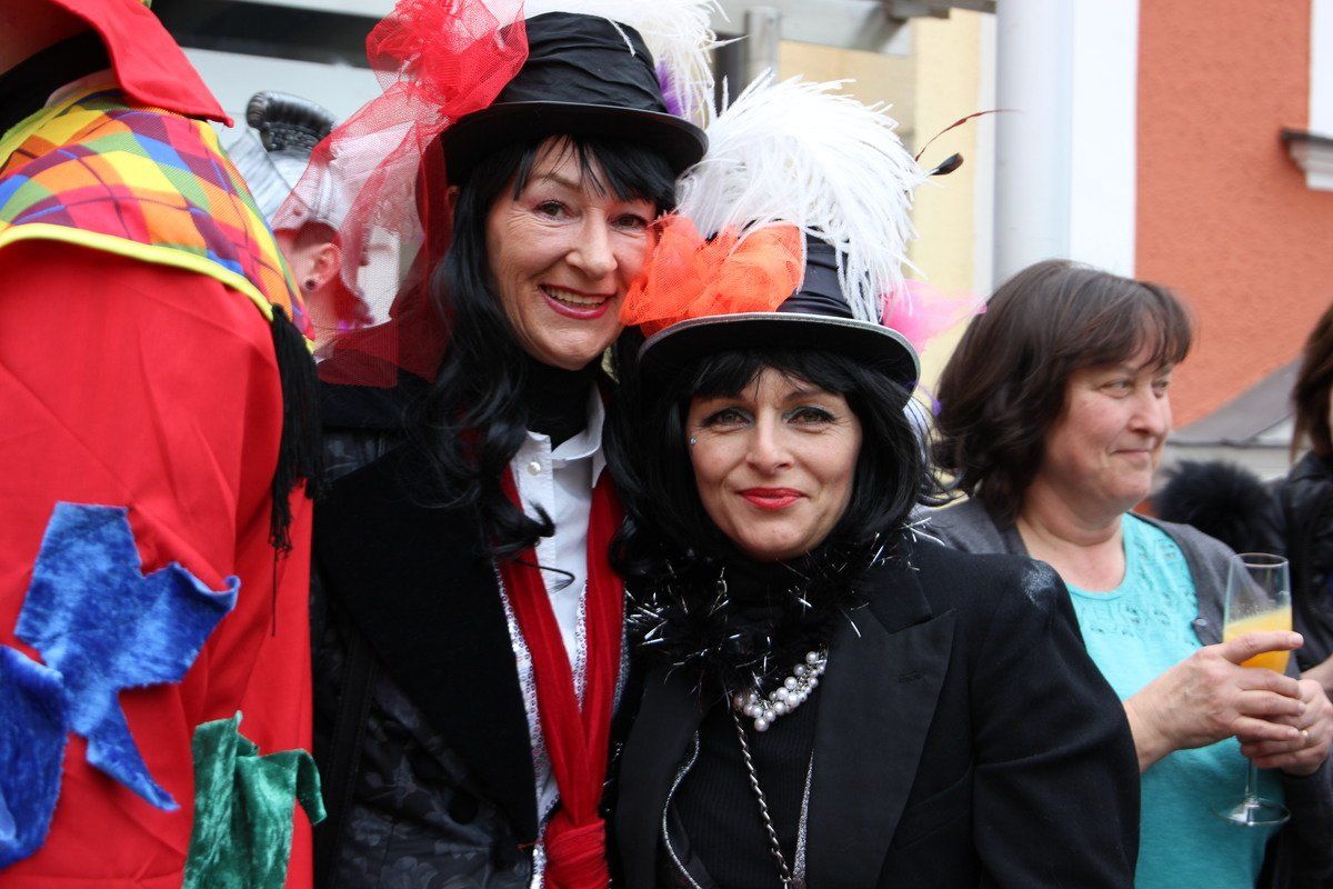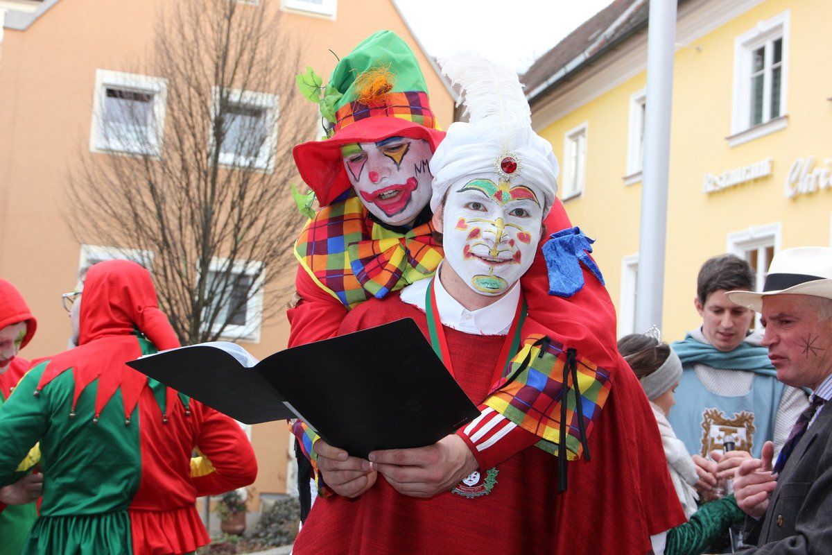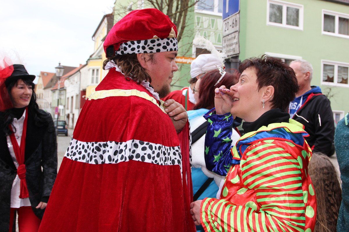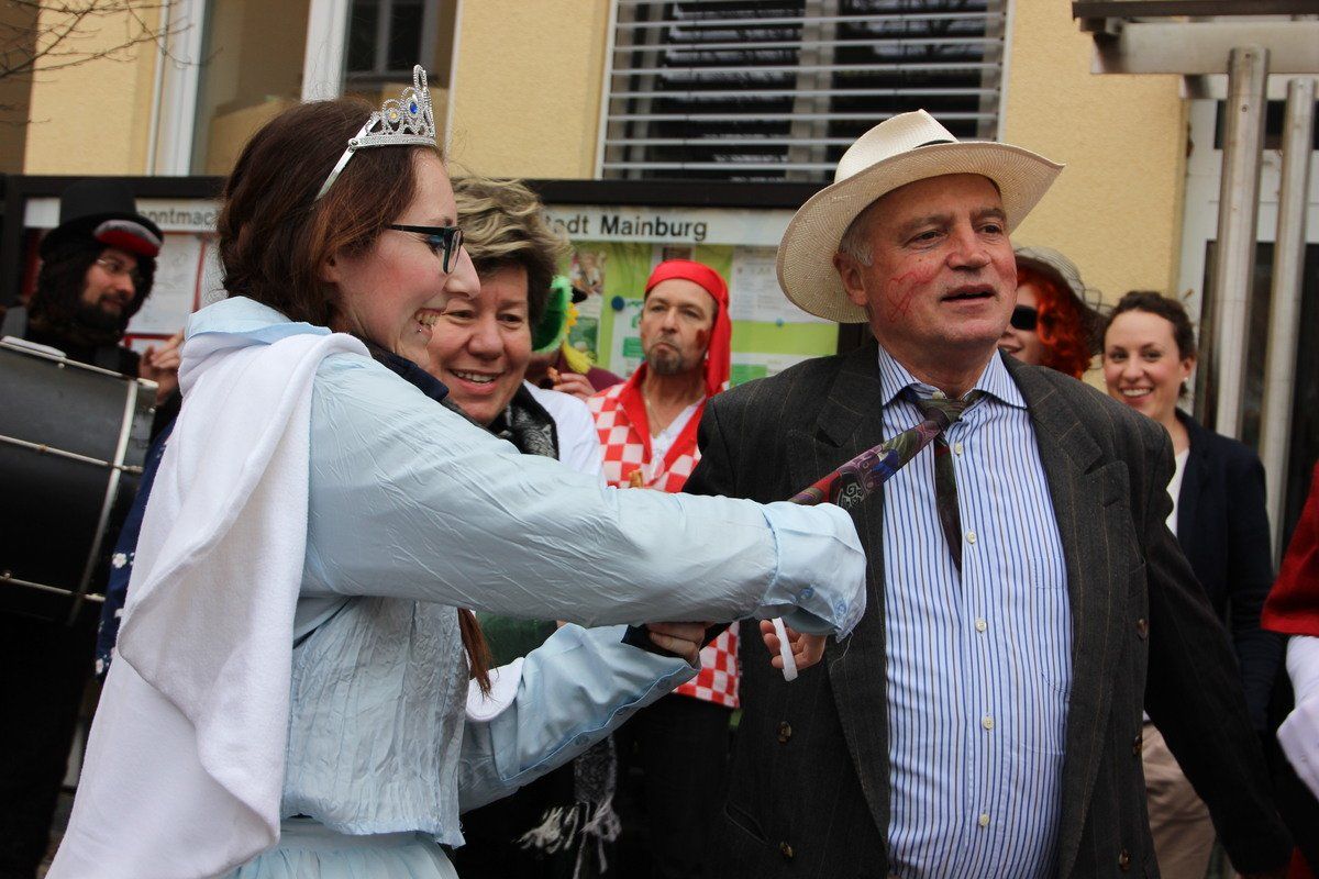 Bürgermeister Sepp Reiser bewies, dass er kein Faschingsmuffel ist, sondern zeigte sich von seiner ausgelassenen Seite und schwang unbefangen mit seiner Stellvertreterin Langwieser ein flottes Bein vor dem Rathaus.