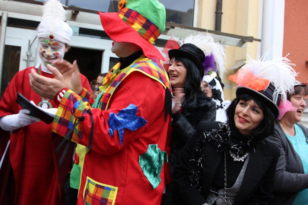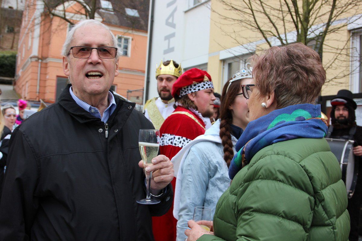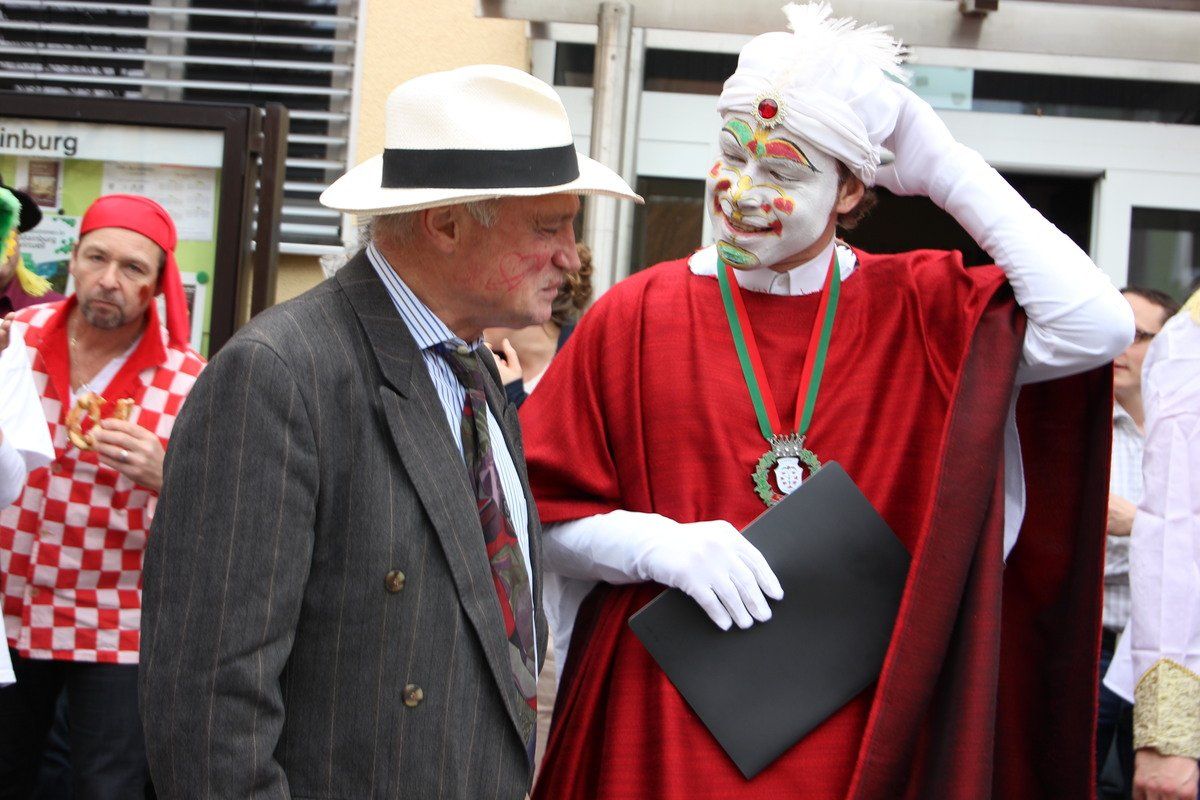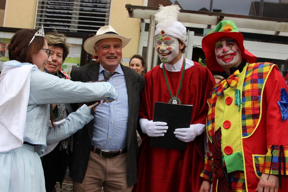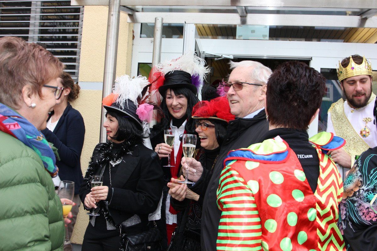 Schnipp, schnapp – und ab war die Krawatte. Kurzer Hand wurde Bürgermeister Reiser am Unsinnigen Donnerstag aus seinem Büro auf dem Rathausvorplatz entführt, dort hatten sich nämlich am Nachmittag die faschingsbegeisterten Narrhallesen eingefunden. Bunt verkleidet und mit jeder Menge guter Laune und einem Gläschen Sekt ließ man den Herrn Fasching nochmals kräftig hochleben.