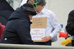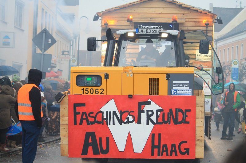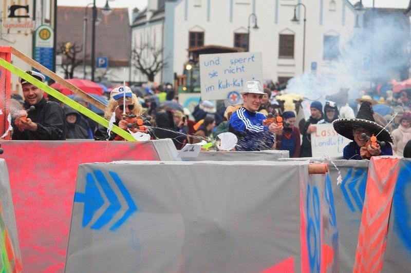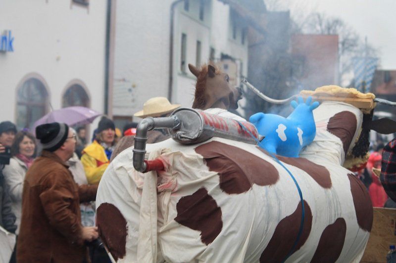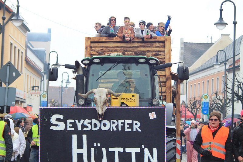 Eindrucksvoll waren auch die Wagen der Umzugsteilnehmer. Neben der riesigen Dampflock der Narrhalla aus Gammelsdorf und den verschiedensten „Hüttn“, befanden sich aber auch mehrere witzige Gefährte mit politischem Hintergrund darunter. Ob die Seysdorfer Kapelle, überworfen mit ihren zwei Planen war, die selbst gebaute Kuh, oder auch das „Sachstandsliste geschlossen- Schild“, ganz ohne Politik ging es auch in diesem Fasching in Nandlstadt nicht.