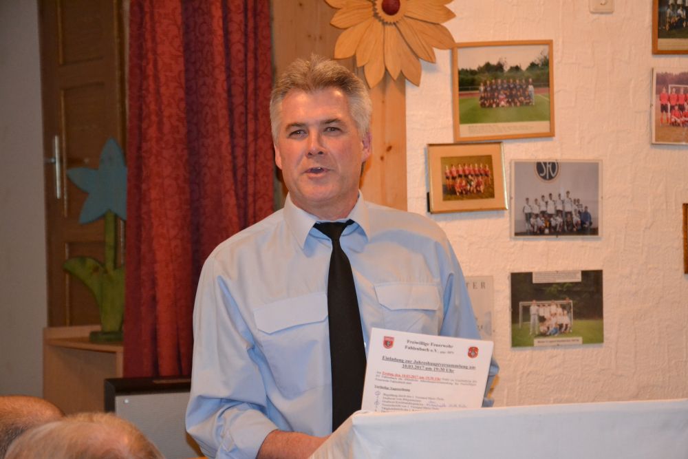 Vereinsvorsitzender Mario Öxler stellte in seinem Jahresbericht vor allem die Vereinsaktivitäten des letzten Jahres vor, unter anderem Maibaumeinholung und –Aufstellung, Teilnahme an Stockturnieren, Treffen mit den Rohrbachern aus dem Burgenland, Dorffest und Weihnachtsfeiern. Er freute sich über den sehr guten Besuch der jetzigen Hauptversammlung (51 Anwesende), vor allem auch über die anwesenden Vorstände anderer Vereine, was auch die gute Verankerung der Feuerwehr in Fahlenbach zeige. Er wies auf die geplanten Veranstaltungen dieses Jahres hin wie die Einführung in die Nutzung des Defibrillators am 23.3. um 19.30 Uhr im Sportheim und die Aufstellung des Maibaums am 1. Mai um 13 Uhr und wünschte sich für alle Veranstaltungen eine rege Teilnahme. Er dankte besonders den freiwilligen Helfern, und da besonders den Damen, die beim Dorffest Kuchen und Küche bestens organisieren.