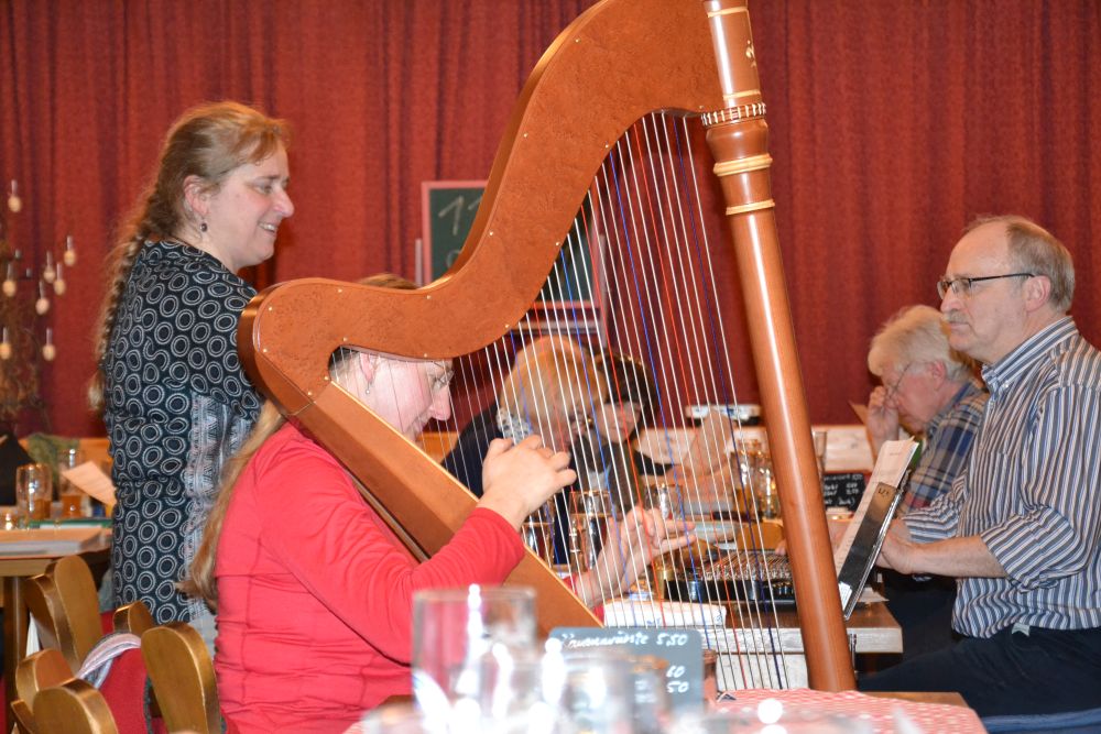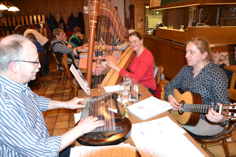 Musikalisch gaben wieder Rosa Karger mit Gitarre, Karoline Frey an der Harfe und Max Beer an der Zither den Ton an und Max Beer half den Sängerinnen und Sängern bei bisher nicht gesungenen Lieder etwas „auf die Sprünge“, indem er durch die Reihen ging und vorsang, dann klappte es auch ganz schnell bei den anderen, denn schließlich kann nicht jeder Noten lesen.