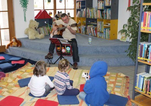 Die Geschichte vom kleinen „Lenz und der Kieselstein“ gibt es eigentlich schon seit 2005. Damals wurde die Geschichte richtig produziert mit Sprecher und allem drum und dran. Dann ist sie leider in den letzten Jahren in Vergessenheit geraten. Autor und Komponist Walter Zinkl bekannt von „Sauglocknläutn“ hat das Stück wieder aufleben lassen und es als Solo umgeschrieben. So nimmt der leidenschaftliche Musiker seine jungen Zuhörer mit zu den aufregenden Abenteuern von Lenz und seinen Freunden. Weil aber zu viel Text schnell eintönig wird, ergänzt Walter Zinkl mit lustigen Liedern die Handlung. Zwei Auer Schulklassen haben sich die einstündige Lesung mit Musik bereits in der Gemeindebücherei angehört und waren begeistert. Drum war es am Samstag wirklich schade, dass nur drei Kinder gekommen waren, aber dafür war es umso schöner.