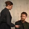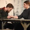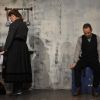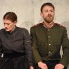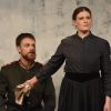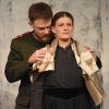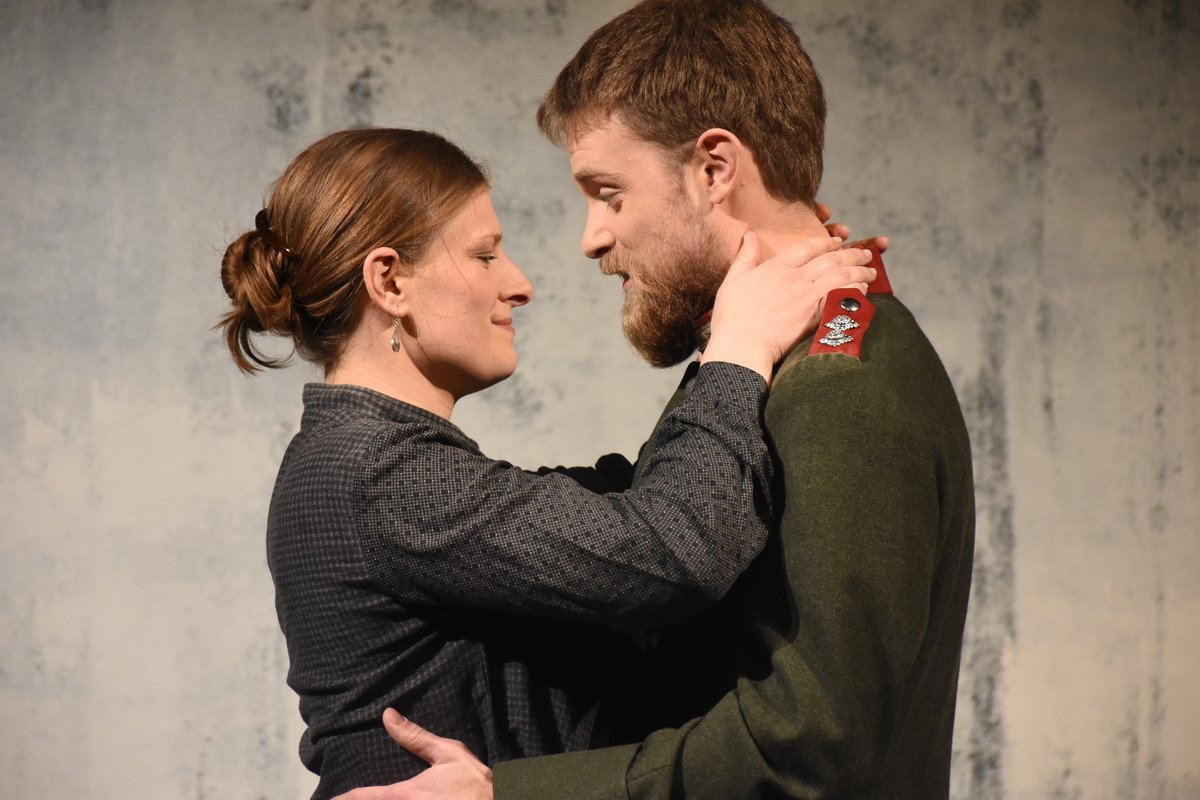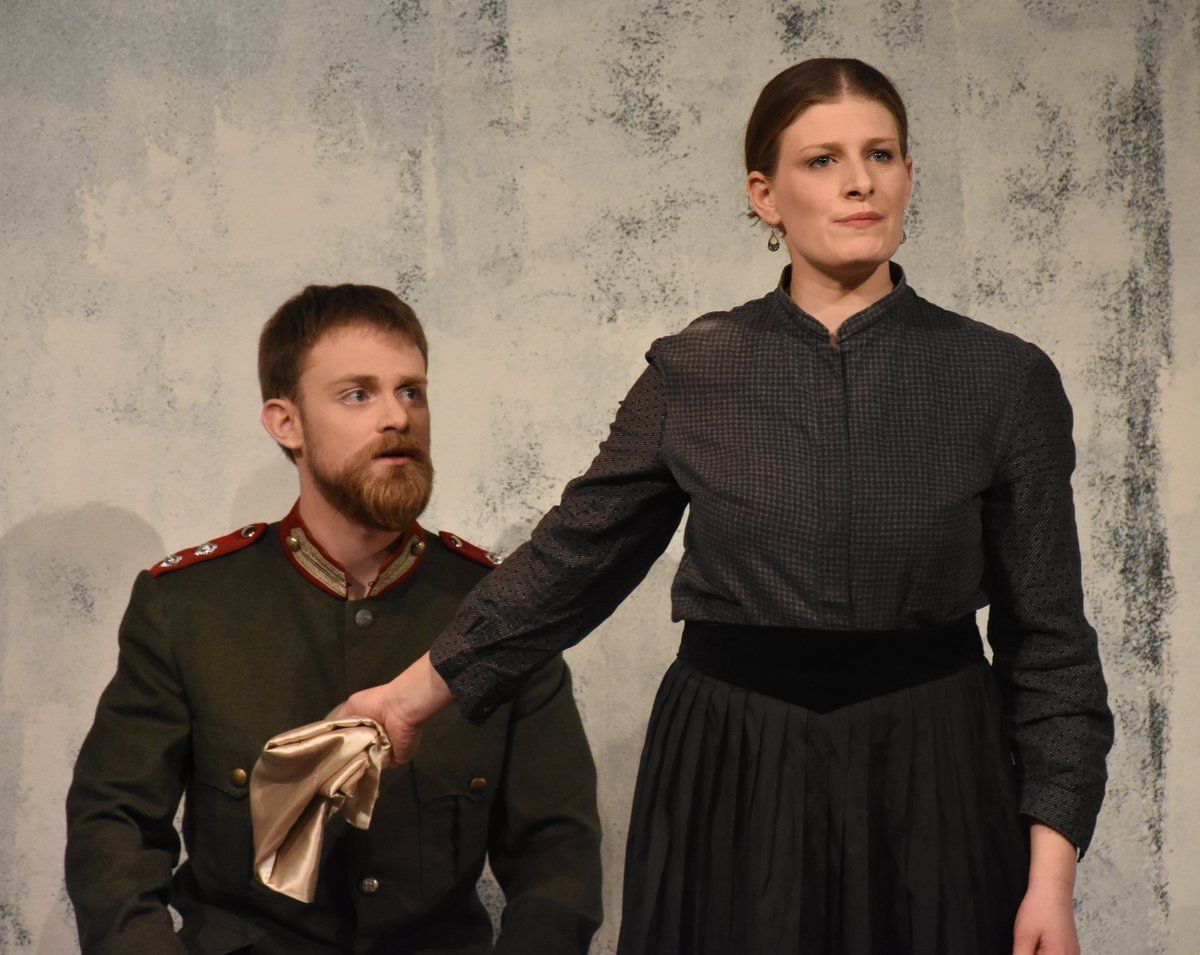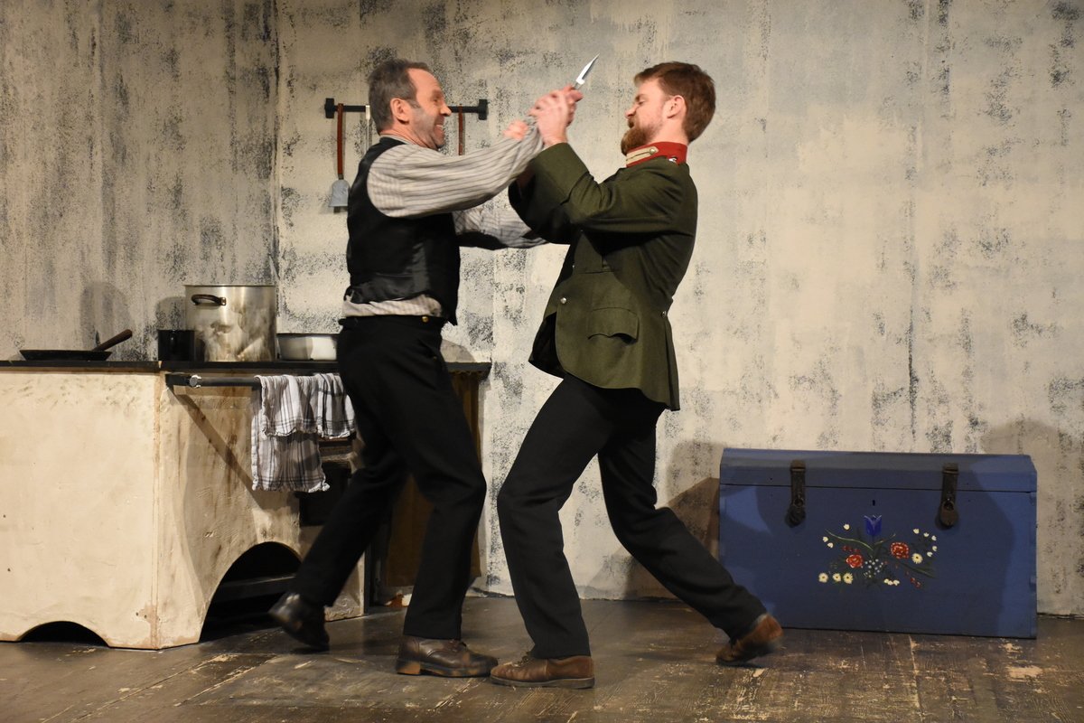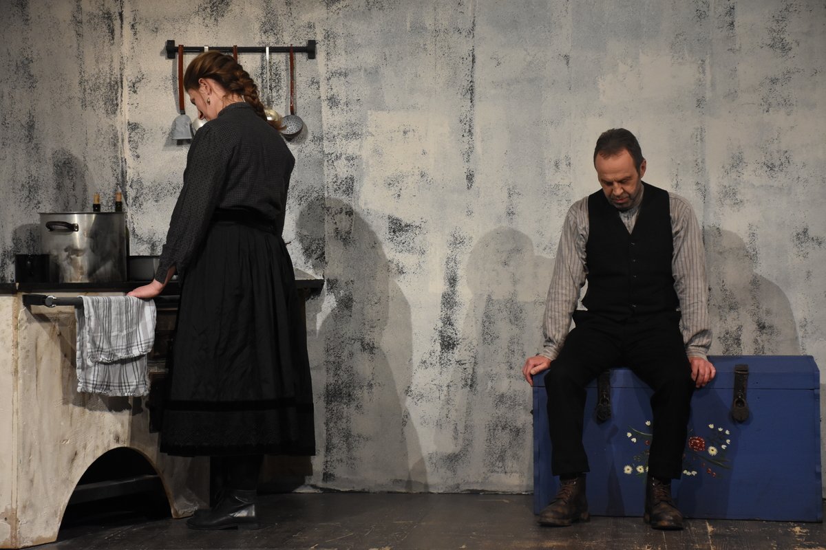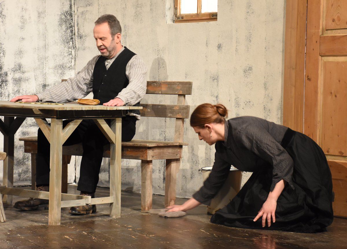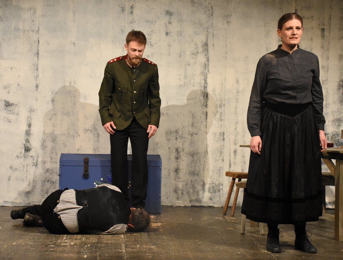 Schließlich geht es zwischen den Dreien ans Eingemachte, der Jäger, der „seine Ehr verweibert“ hat, ersticht den Mann im Duell. Bühnenbildner Franziska und Reinhold Wimmer haben einen beklemmenden Bretterguckkasten mit nur wenig Mobiliar zusammengestellt, in dem sich ein Katz-Maus Spiel entspinnt, das den Zuschauer bis zum Schluss fesselte.