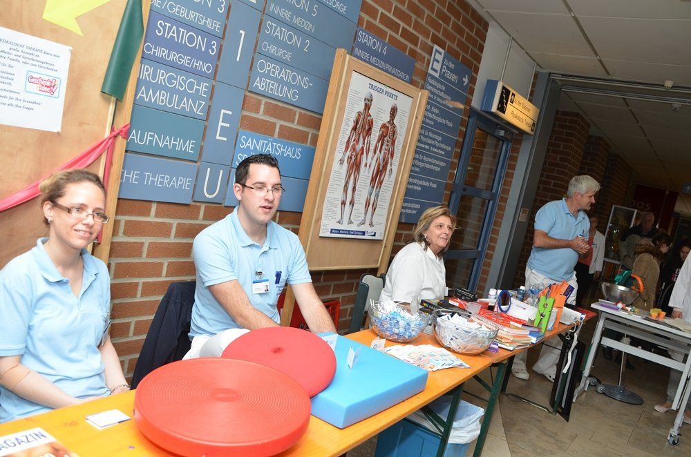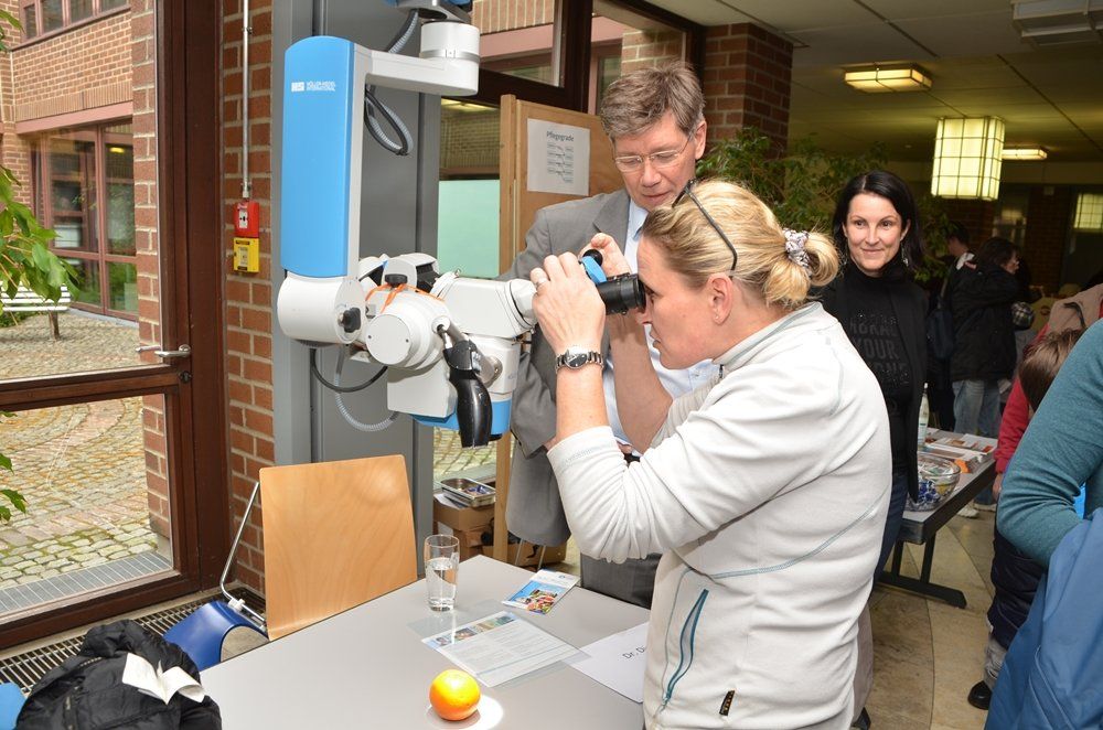 Die Ultraschalluntersuchung der Halsschlagadern zur Schlaganfallvorsorge führte Chefarzt Peter Grein vor und mit einem Alterssimulator konnte man sich in die Situation alter Menschen versetzen. Im offenen Operationsaal wurden Knieprothesenoperationen und Schlüsselloch-OPs bei Wirbelsäuleneingriffen simuliert.