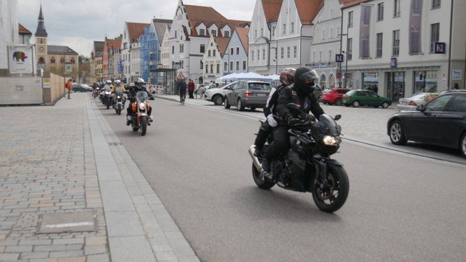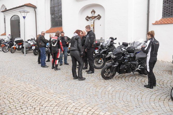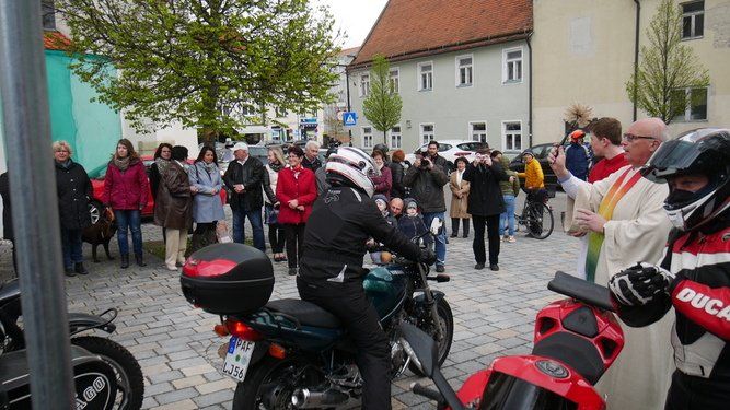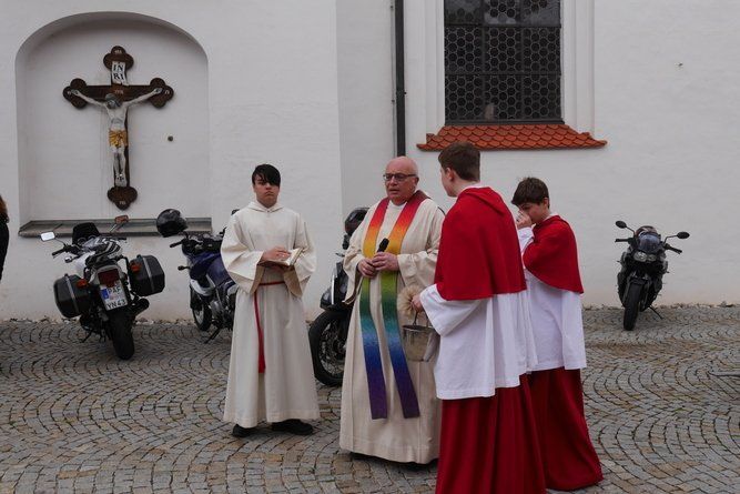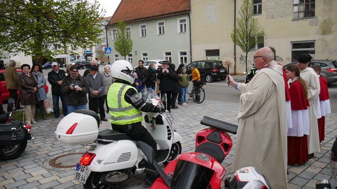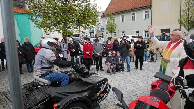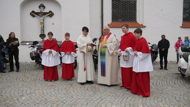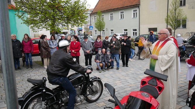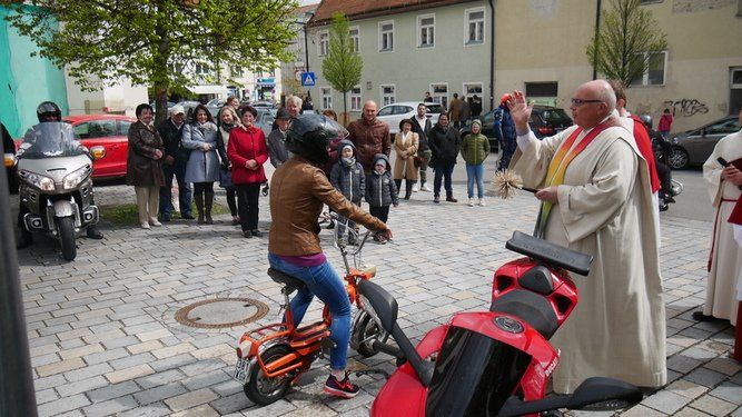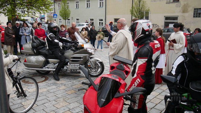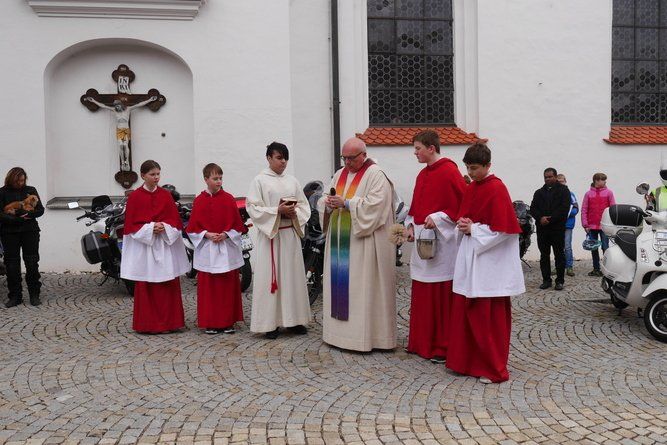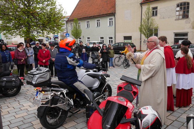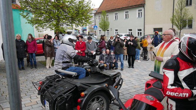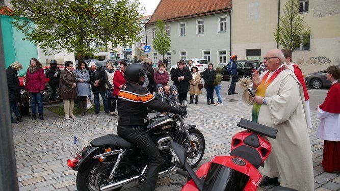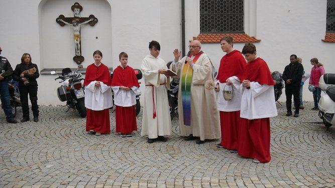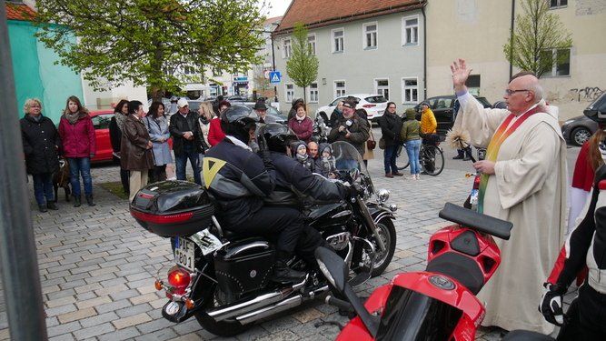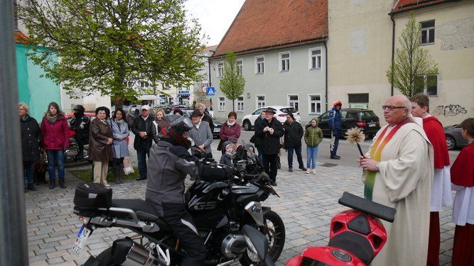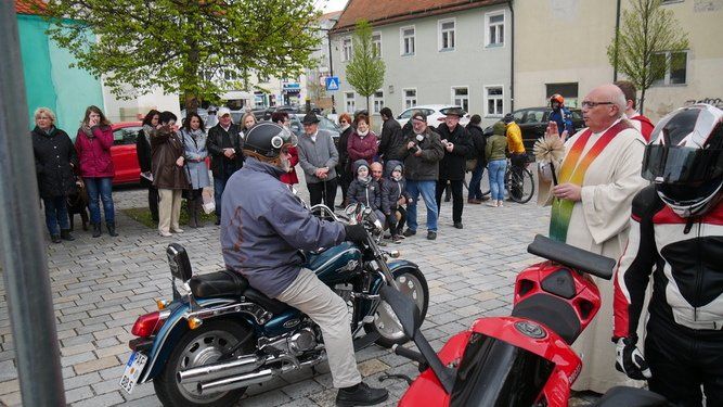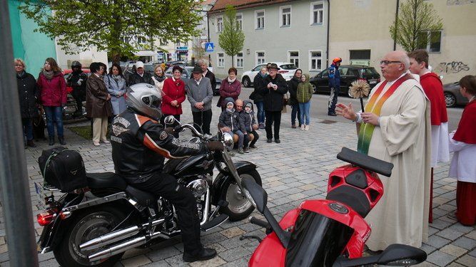 Seine erste Motorradweihe in Pfaffenhofen hat Stadtpfarrer Albert Miorin am Sonntag, nach einer ausführlichen Messfeier, gut 50 Bikern vor der Stadtpfarrkirche St. Johannes Baptist gespendet. „Glauben muss man spüren, sonst hilft er nicht“, frei nach Wiesn-Pfarrer Schießler, bedachte der Geistliche, Fahrer und Fahrzeuge mit einer ordentlichen Portion Weihwasser.