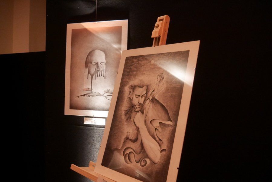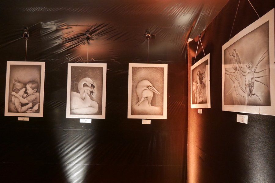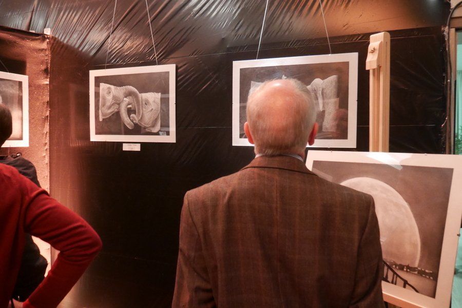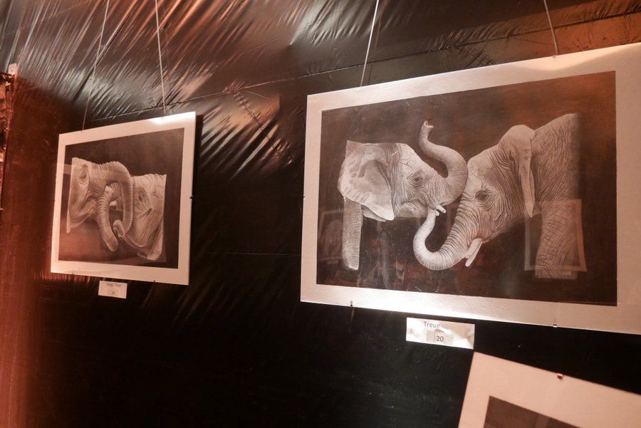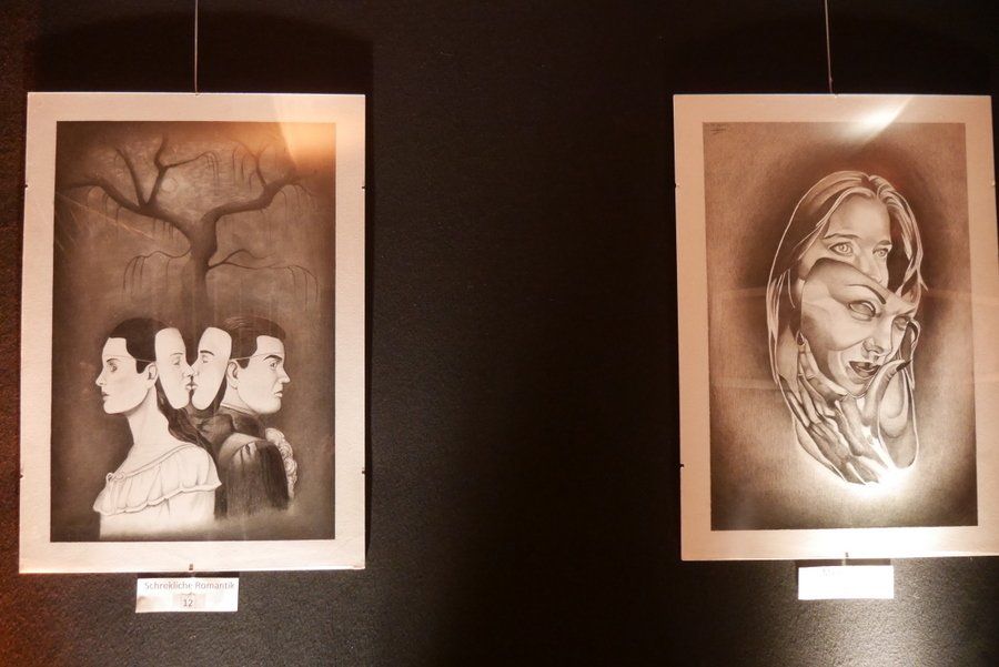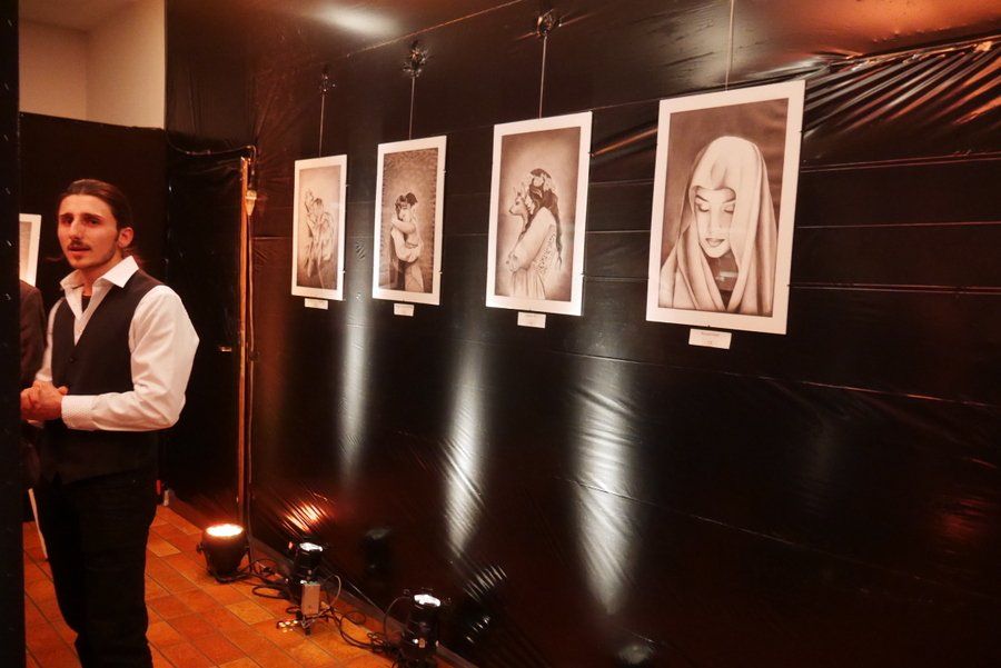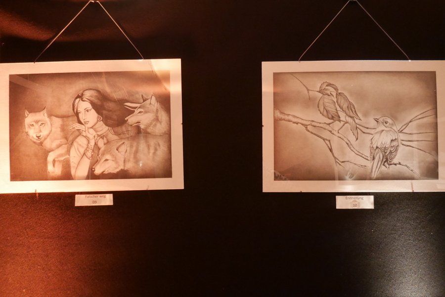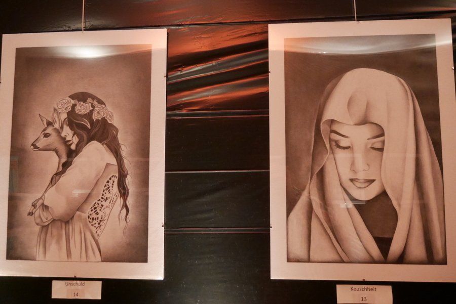 Was ist die Liebe im Leben, mit dieser Frage befasst sich der junge Künstler in Schwarz -Weiß Technik. Seine Zeichnungen erstellt er mit 8 verschiedenen Bleistiftstärken und einer speziellen Radiertechnik. Die einzelnen Bilder haben Titel wie Ewige Treue, Vertrauen, Zärtlichkeit, Liebe, Ewiger Zusammenhalt usw. Die Begriffe hat der junge Syrer in Deutsch unter die Bilder gesetzt und laden eigentlich nur ein, sich Gedanken zu machen. Die Arbeiten können auch gut alleine stehen, die Umsetzung der Themen ist gekonnt und sicher. Auf Anfrage macht Hasseb Khalefa auch Portraits nach Fotovorlage, ein „Muster“ aus den 50zigern hängt in der Ausstellung.