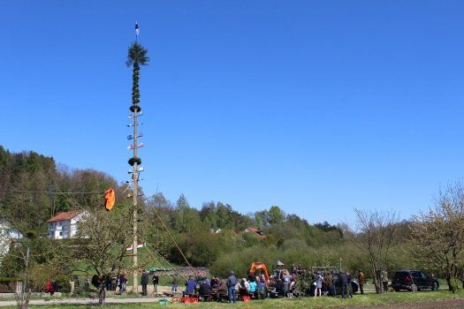 Einer der 1. Maibäume im Landkreis steht bereits. Traditionell und mit viel Muskelkraft . Auch heuer stellte der Burschenverein Larsbach wieder „seinen“ Maibaum auf. 28 Meter ist er hoch, der Neue und wird nun für ein Jahr den Platz mitten im Dorf neben den Spielplatz verschönern.