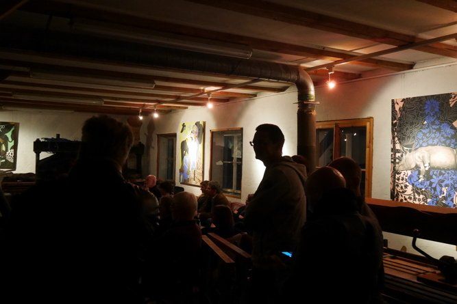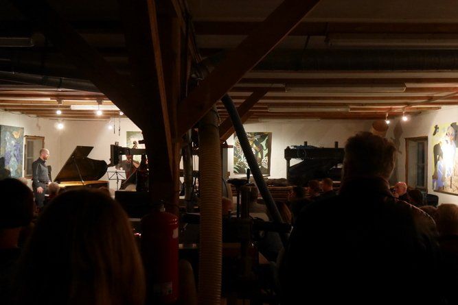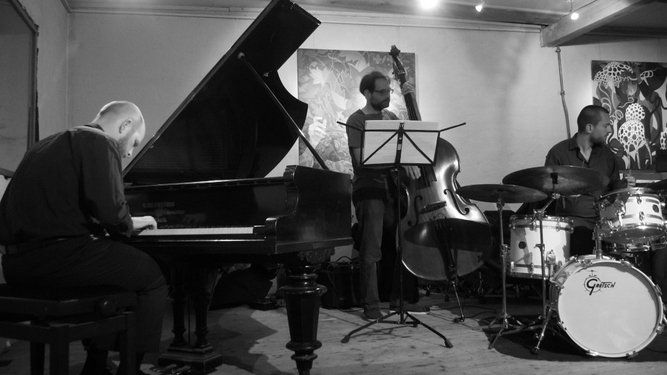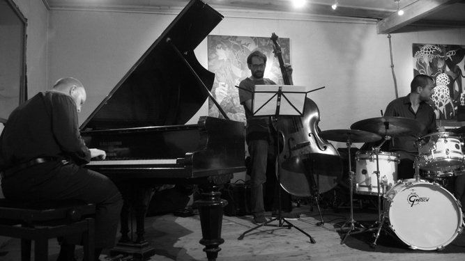 Ein redseliger Jazzer ist eher selten und so war das gut gelaunte Publikum zwischen den Stücken auch dankbar für die spannenden Geschichten zur, auch technisch perfekten, Darbietung. Das Geheimnis eines guten Trios ist zu spielen wie ein Instrument oder anders, die Farben machen das Bild, wie auch die laufende Ausstellung von Tita Heydecker und Edith Kronawitter beweist. (http://www.semantik-art.com/)