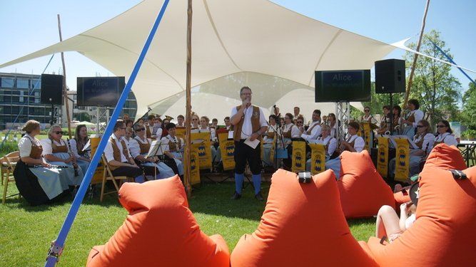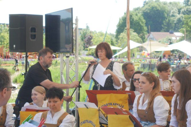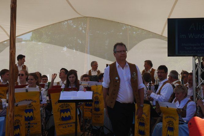 Manfred Leopold, Leiter der Stadtkapelle Pfaffenhofen, hatte am Sonntagvormittag auf der Gartenschau Pfaffenhofen, seine liebe Mühe, die Musiker unter das Zeltdach der kleinen Bühne im neuen Bürgerpark zu bringen. Die Sonne strahlte, wie die Musiker und die erwartungsvollen Kinderaugen im Publikum, schon in voller Pracht.