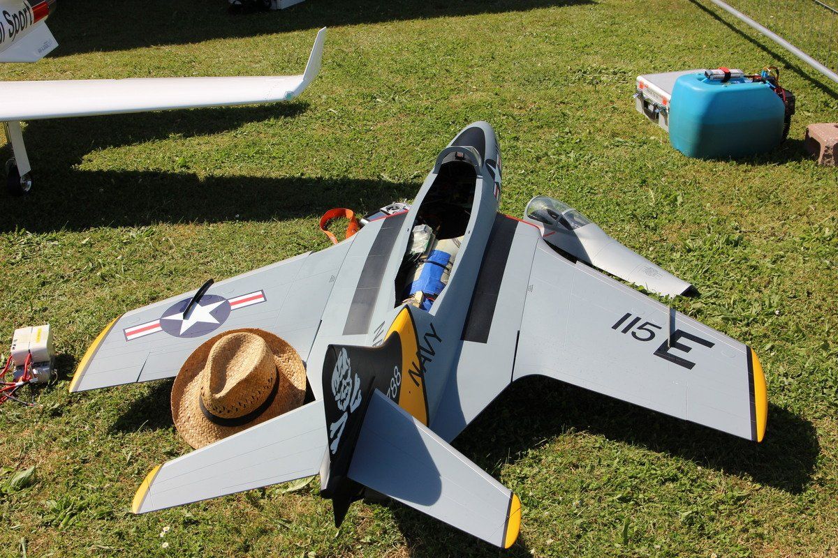 Karlheinz Feldmeier, 2. Vorstand des MBC-Ikarus, zeigt ein Modell aus der Navy-Kunstfliegerstaffel "Blue Angels", einem Nachbau aus dem Film "Top Gun"