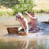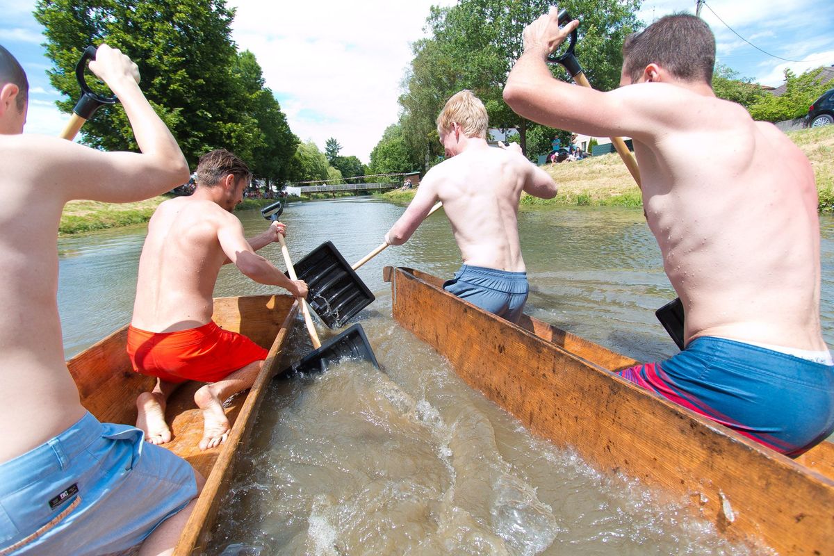Nass ging es nach dem Mittagessen gleich weiter bei dem superlustigen Sautrogrennen. Das einmalige Spektakel, bei dem die insgesamt 16 Sautrogmannschaften à zwei Personen vom Ufer der Abens aus kräftig herumpaddelten, sorgte für erheiterte Gemüter. Lustig anzuschauen war dieser Balanceakt im Holztrog, mit Musik und Moderation von Sollklangstelle, allemal.