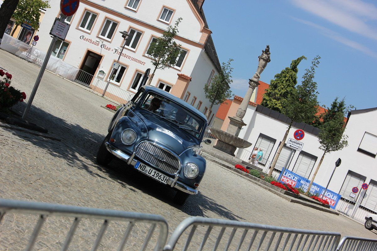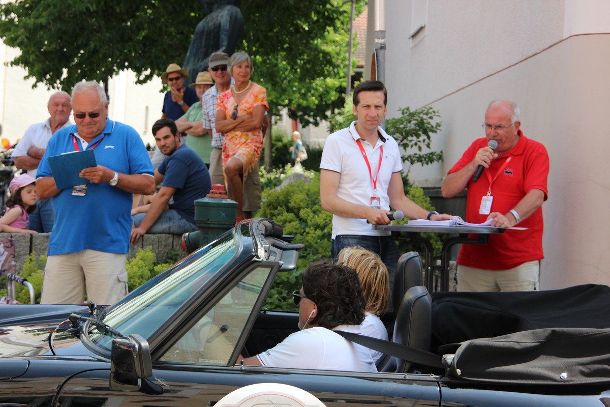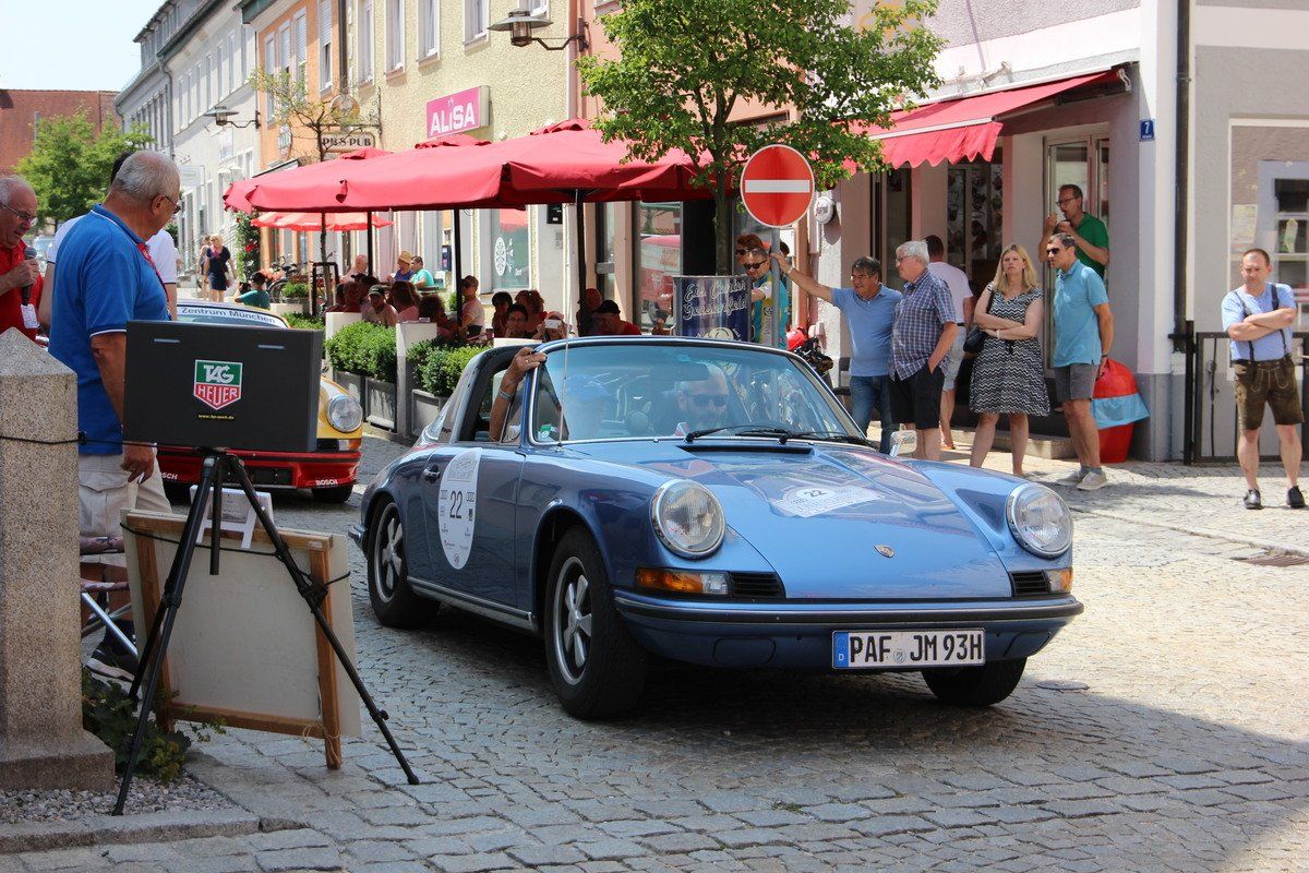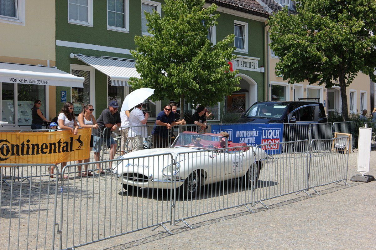 Relativ pünktlich um 14:17 Uhr trudelten die betagten Flitzer am Rathausplatz ein und schön brav düste einer nach dem anderen über die Startlinie. Genau austariert wurde die Geschwindigkeit beim Ausfahren der Kurve um den Marienbrunnen herum, denn um die Wertungsprüfung zu bestehen, durfte man weder zu schnell noch zu langsam sein. Nach Ende des Spektakels ging es schnurstracks weiter zur nächsten Wertungsprüfung am Luimex in Pfaffenhofen.