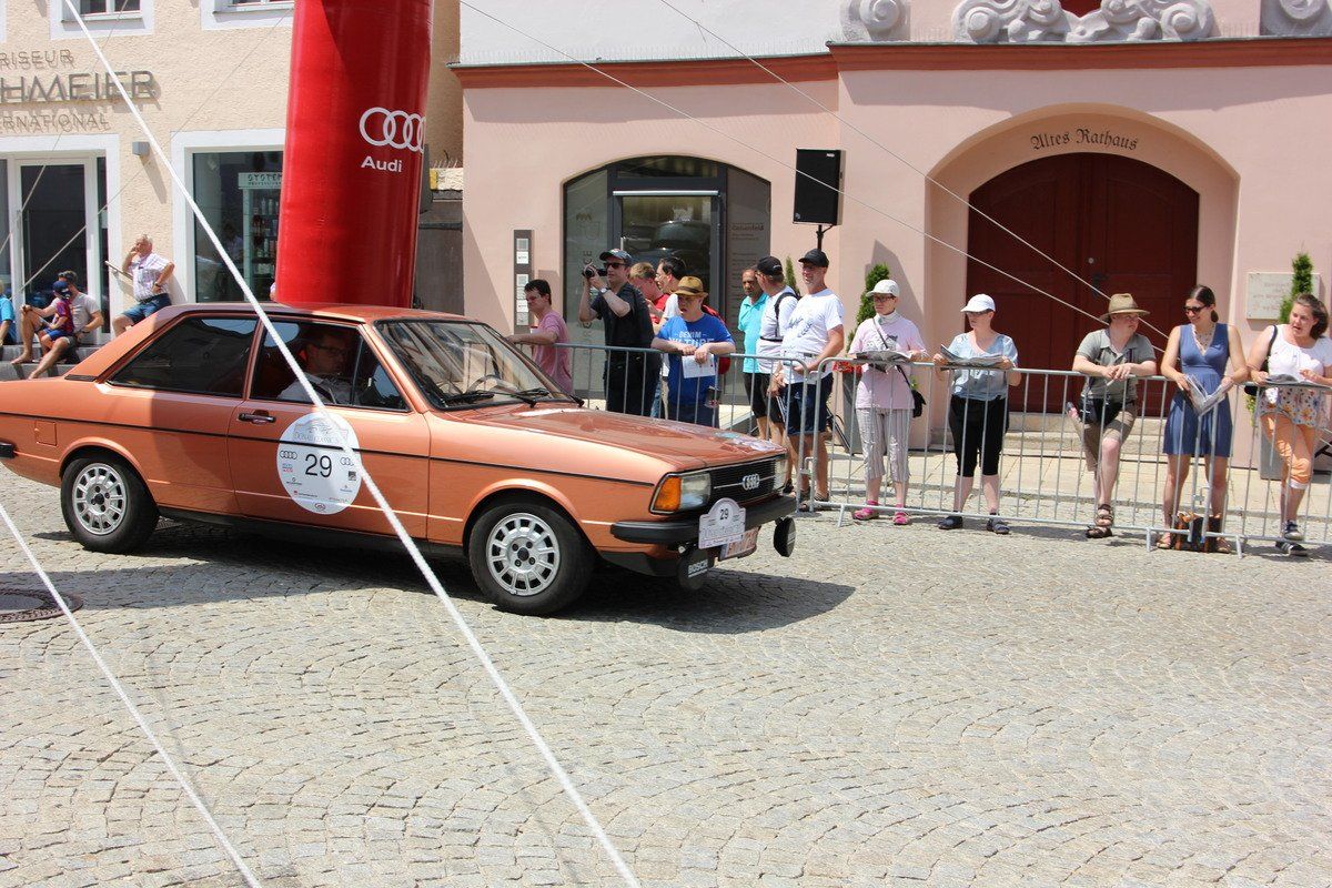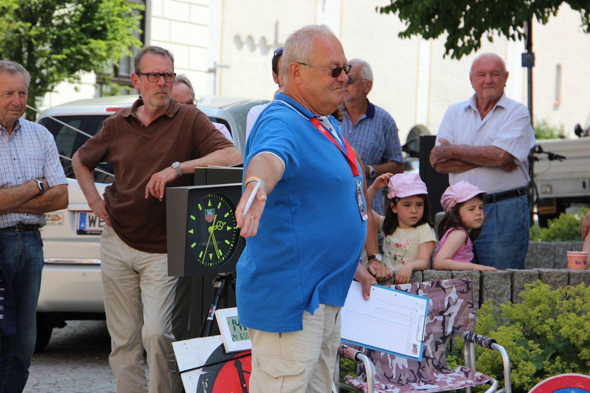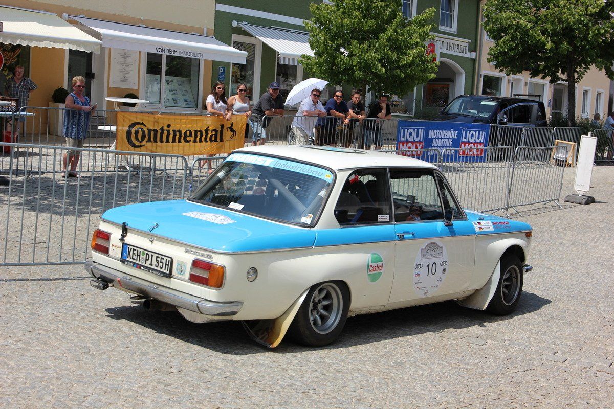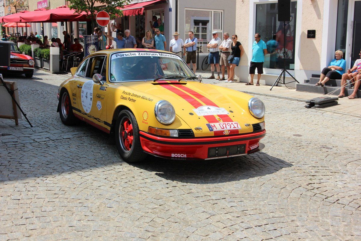 Relativ pünktlich um 14:17 Uhr trudelten die betagten Flitzer am Rathausplatz ein und schön brav düste einer nach dem anderen über die Startlinie. Genau austariert wurde die Geschwindigkeit beim Ausfahren der Kurve um den Marienbrunnen herum, denn um die Wertungsprüfung zu bestehen, durfte man weder zu schnell noch zu langsam sein. Nach Ende des Spektakels ging es schnurstracks weiter zur nächsten Wertungsprüfung am Luimex in Pfaffenhofen.