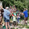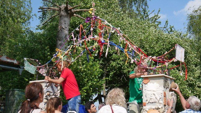 Nach Backofen, Rosenbogen, Bienenstand, Zisternen und Wegebau ist das Friedenstor wieder ein gelungenes Gemeinschaftswerk, die Soziale Skulptur Hallertauer wächst, Beuys hätte seine Freude. Die Metamorphose des Bunkergartens in den InterKulturGarten ist auf einem feinen Weg.