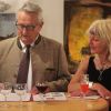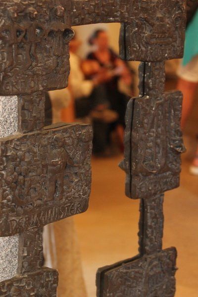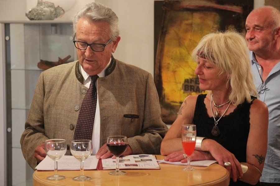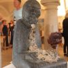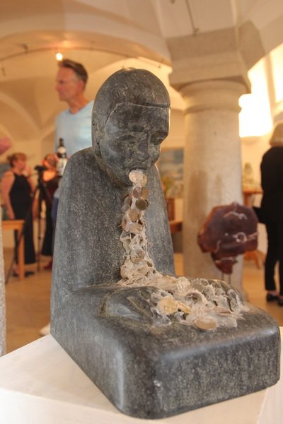 Schon beim Eintritt in den Rathauskeller begrüßte die Gäste eine eher ungewöhnliche Skulptur. Ein kleiner Mensch aus Stein erbrach Münzen – für Bildhauer Helmut Raum die Versinnbildlichung der weltweiten Gier der Banken. Entstanden ist das Werk kurz vor der Weltwirtschaftskrise im Jahr 2008. „Die konnten damals ihren Hals nicht voll genug bekommen“, erklärte der Künstler. Doch auch etwas leichtere Kost gehörte im wahrsten Sinne des Wortes zu seinem Repertoire. „Meine Frau hat gesagt, mach doch mal eine Skulptur von dem, was du in deinem Berufsleben am meisten in der Hand hattest. Da hab ich eine Leberkassemmel gemacht“, so der sympathische Bildhauer.